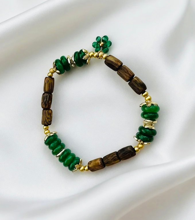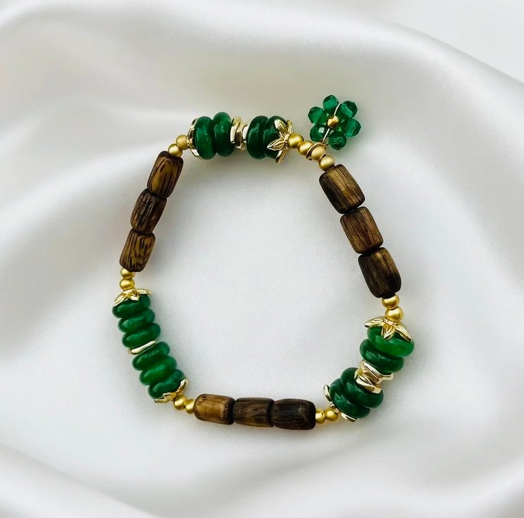 Emerald Agarwood Glow-Double Looped Green Crystal Bracelet with Round Kynam Agarwood Beads