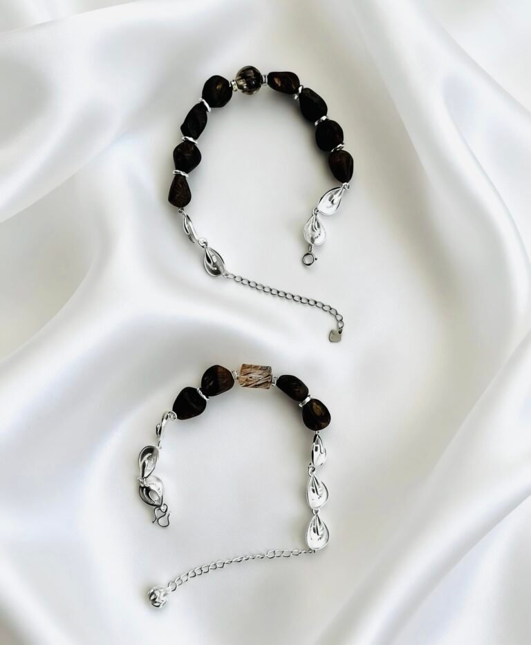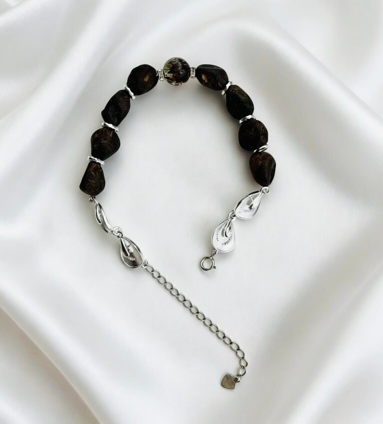 Silver Peacock Feather, Kynam Agarwood & Rutilated Quartz Bracelet