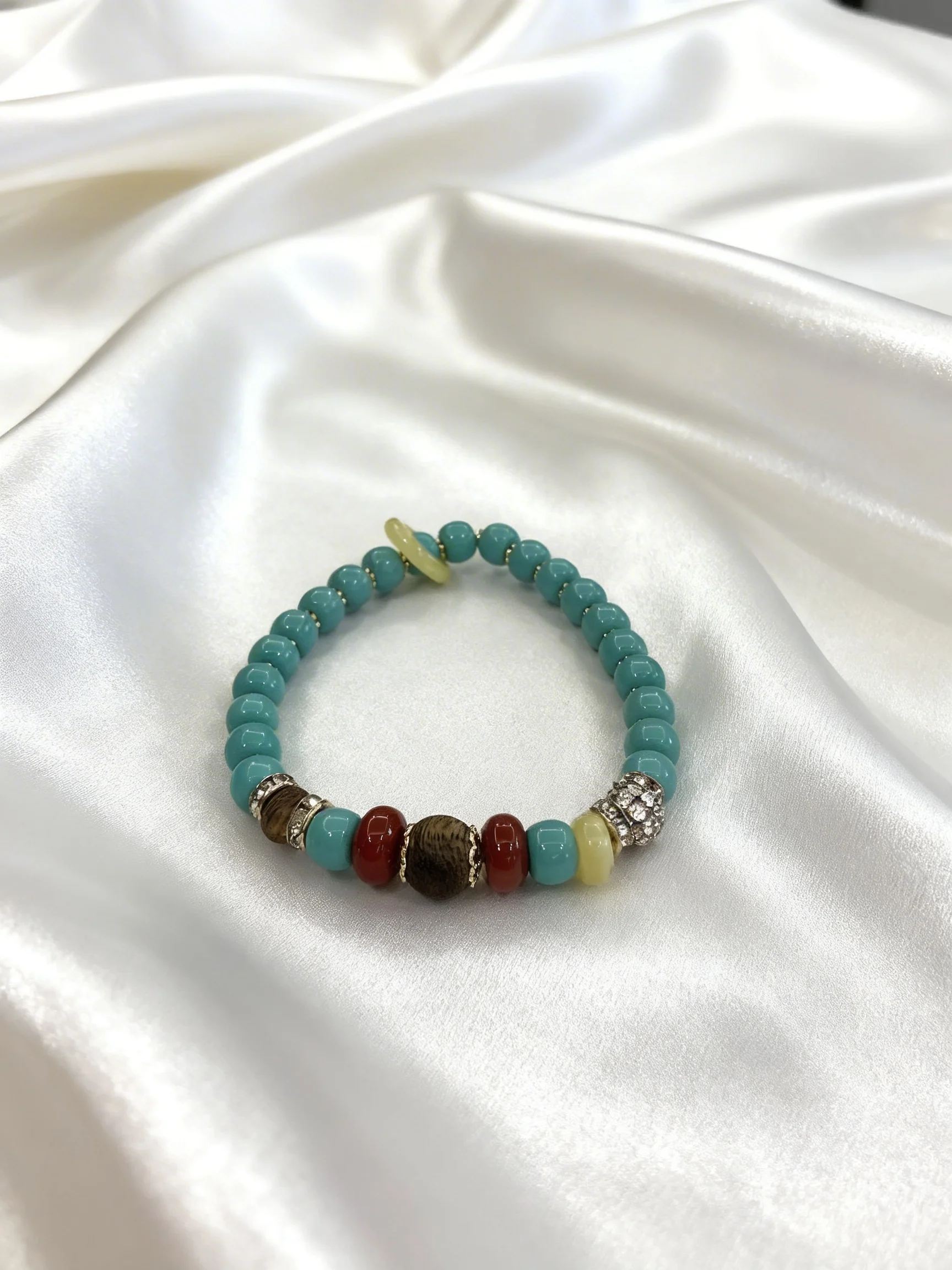 Crafted with smooth, sky-blue turquoise barrel beads as the core, this bracelet exudes a calm, bohemian charm that evokes the serenity of clear mountain waters. The vibrant turquoise is artfully accented with warm honey amber, rich red agate, and premium Kynam Agarwood beads, creating a harmonious blend of cool and warm tones that elevates any outfit. Silver-plated spacer beads add a subtle, sparkling detail, catching the light with every movement. The standout large amber safety buckle charm not only serves as a striking focal point but also carries a traditional symbol of protection and good fortune.