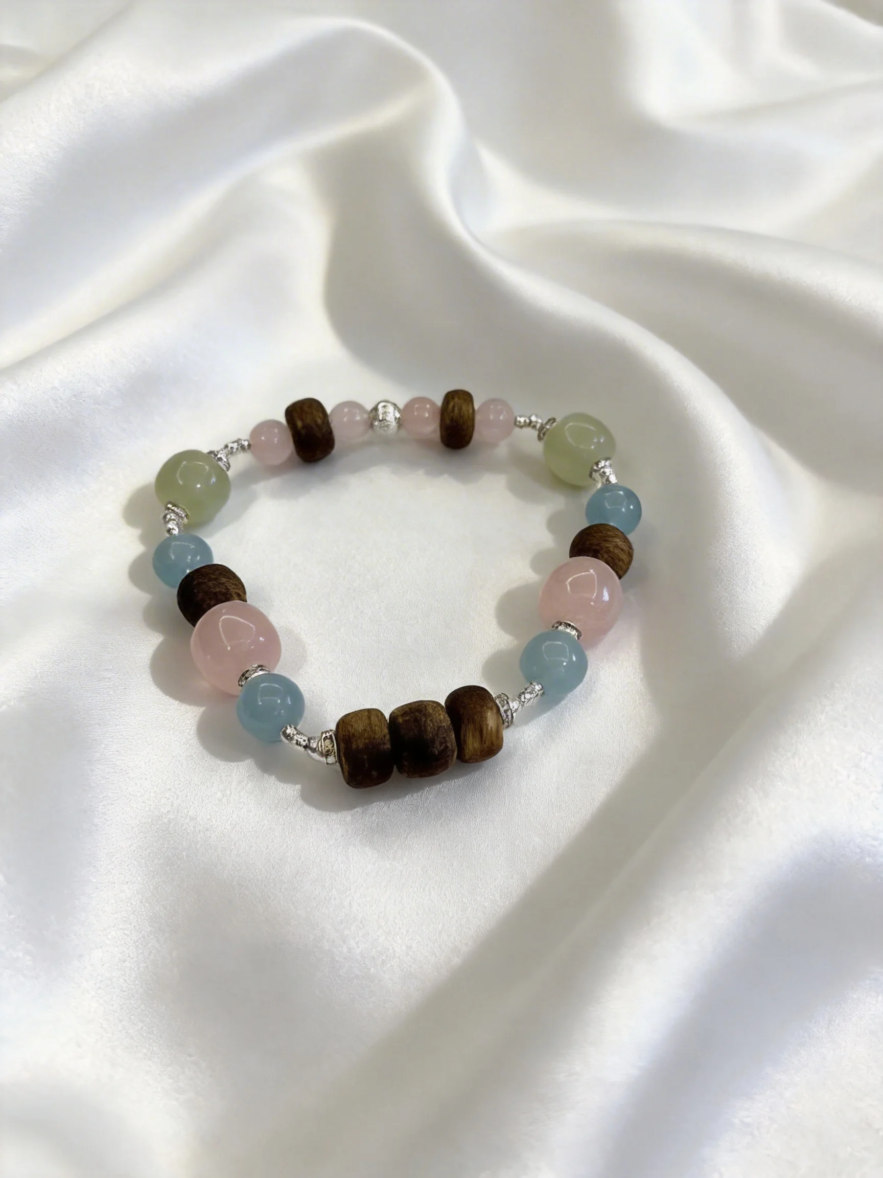 Thoughtfully interspersed are premium Kynam Agarwood beads, their warm, earthy texture and subtle, lingering fragrance balancing the bright gemstones with a sense of calm and timeless elegance. Dainty silver spacers add a subtle, sparkling detail, elevating the design with understated luxury.