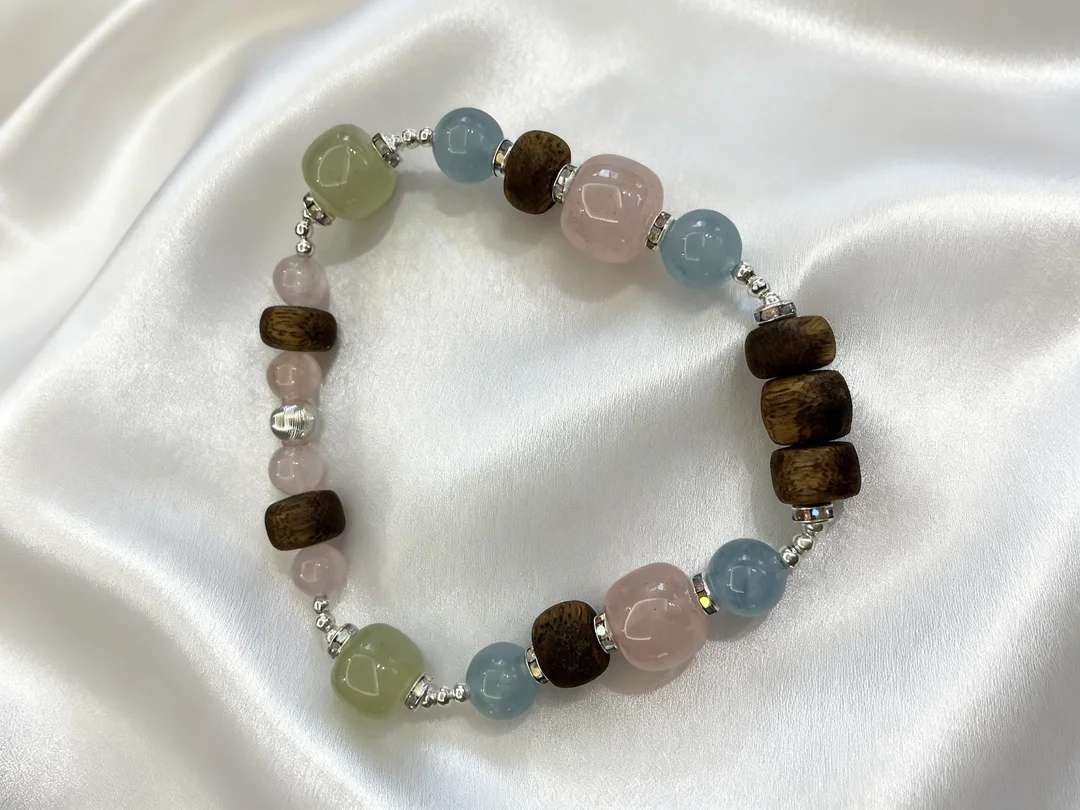 This delicate design features a curated palette of pastel macaron-hued gemstones: blushing rose quartz evokes the tender pink of peach blossoms, sky-blue aquamarine mirrors the clear spring sky, and soft green prehnite captures the fresh new leaves of the season. Each smooth, polished bead glows with a luminous, milky luster, creating an irresistibly sweet, youthful aesthetic.
