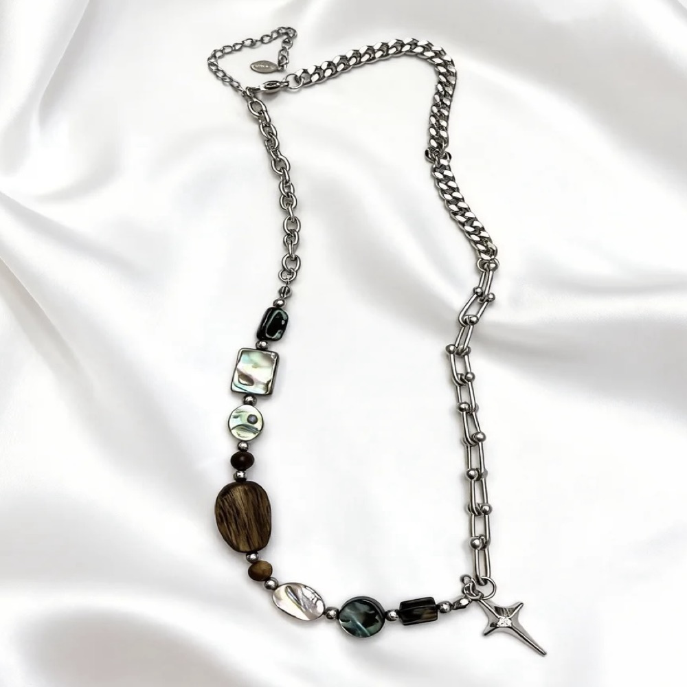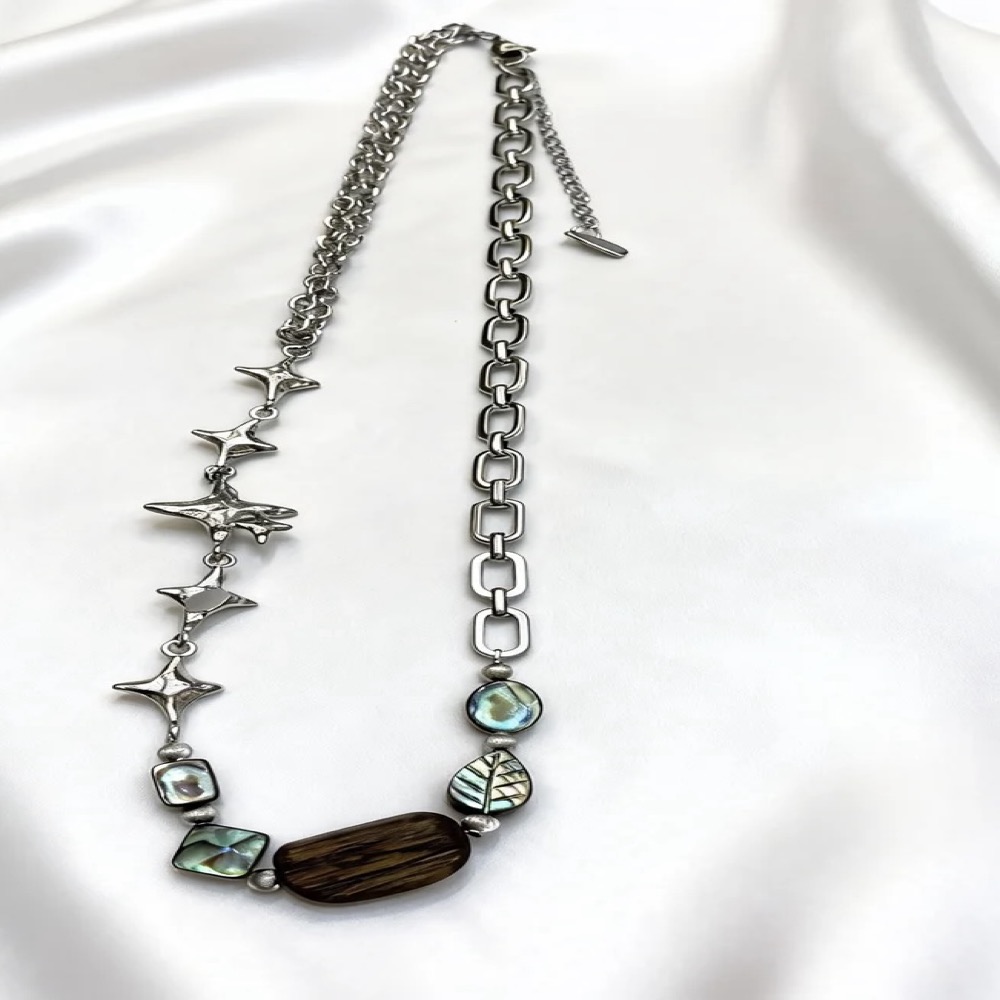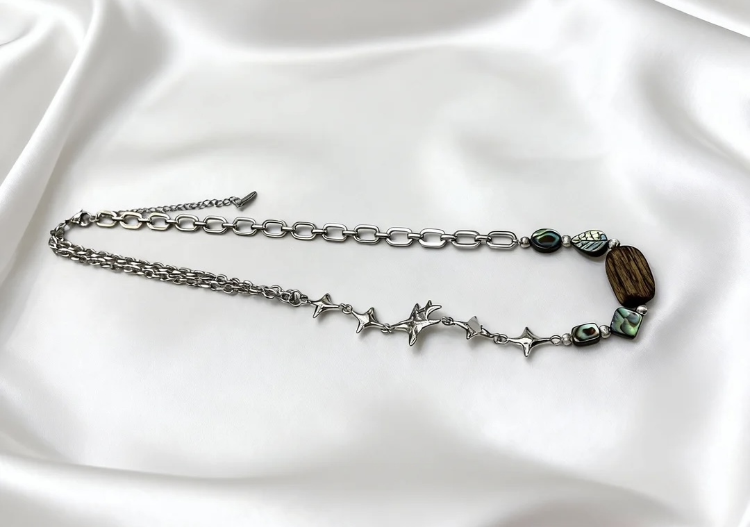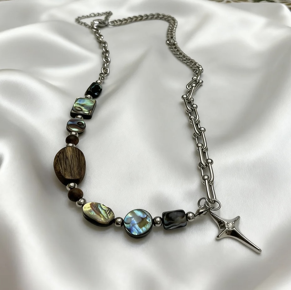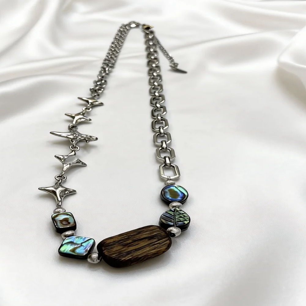 A necklace featuring three abalone shell square beads paired with agarwood rectangular beads symbolizes the heartfelt embrace of the ocean and forest transcending boundaries. The abalone shell square beads emit the ocean’s unique iridescent luster, with irregular square edges resembling reefs polished by waves. Each piece shimmers with the imprint of tides, as if encapsulating the mystery and vibrancy of the deep sea; the agarwood rectangular beads exude the steady depth of the forest, with the warm, smooth wood grain concealing the breath of ancient trees. The rich fragrance is like the quiet whispers of the rainforest, settling with the weight of time. When combined, the vibrant luster of the abalone shell complements the understated texture of the agarwood, like gentle waves caressing the forest-lined shore. This union grounds the vitality of the ocean while infusing the forest’s tranquility with a touch of flowing poetry. When worn, the neck becomes a microcosm of the convergence of sea and land, allowing one to touch the vastness and vitality of the ocean while sensing the depth and tranquility of the forest-a vivid portrayal of the harmonious coexistence of all things in nature.