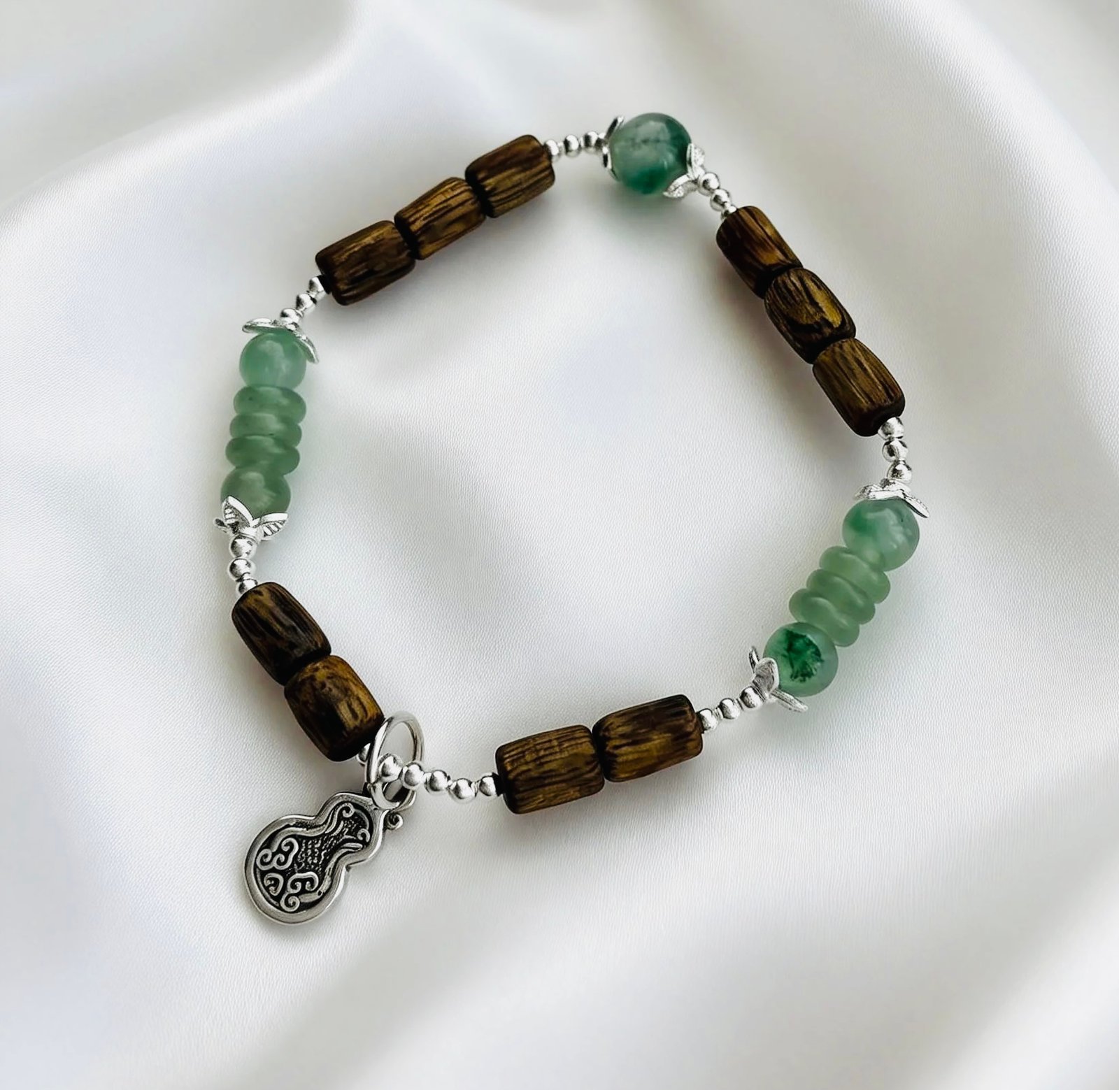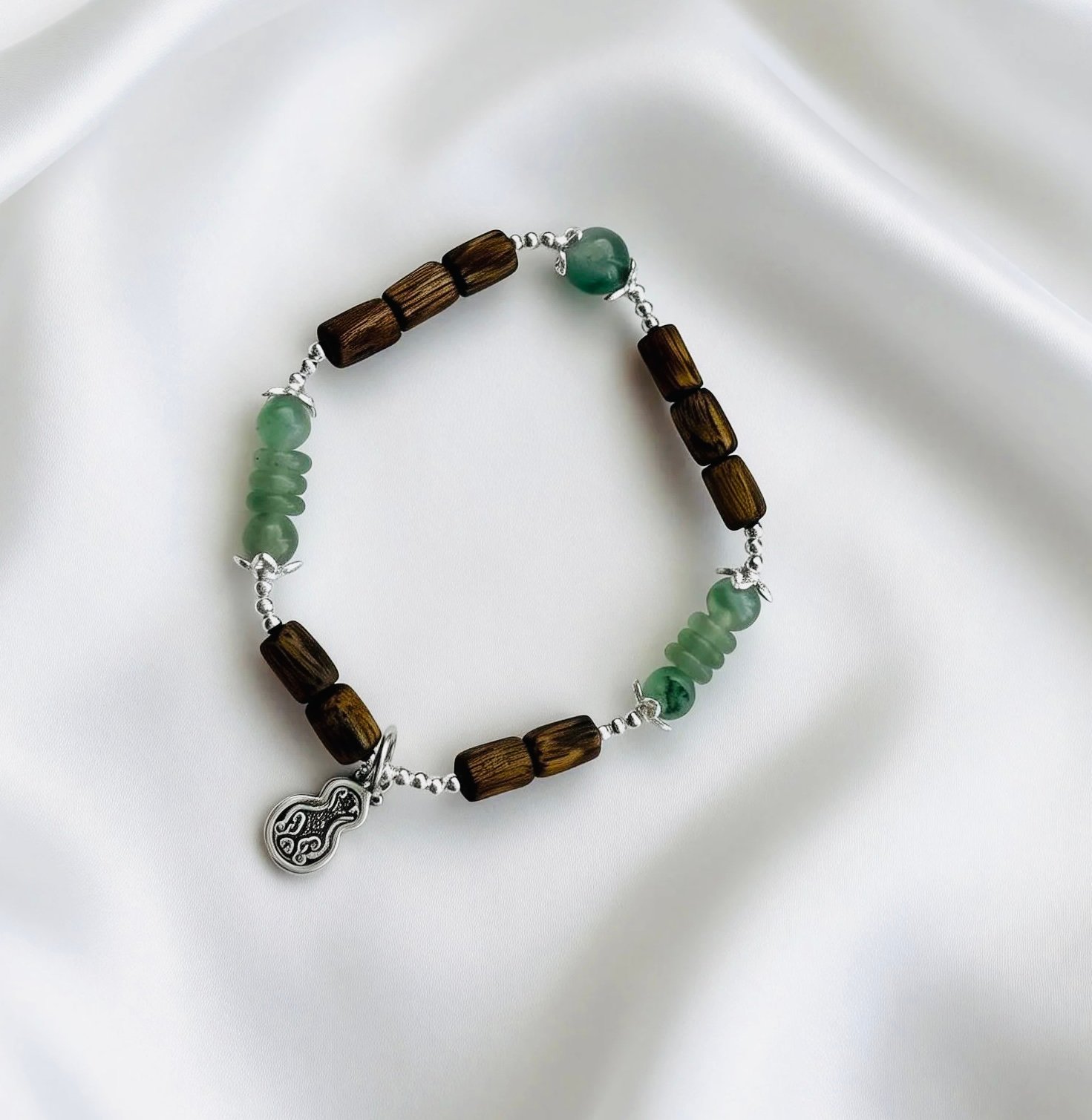 Mellow Kynam Agarwood bamboo beads, infused with natural woody aroma, are interwoven with translucent African jade abacus beads, finished with a delicate silver gourd charm. The bamboo beads symbolize steady progress, the abacus beads carry wishes for prosperity, and the gourd represents fortune and blessings. The rich scent of agarwood complements the fresh green hue of African jade, creating an elegant wrist accessory that holds traditional Chinese blessings.