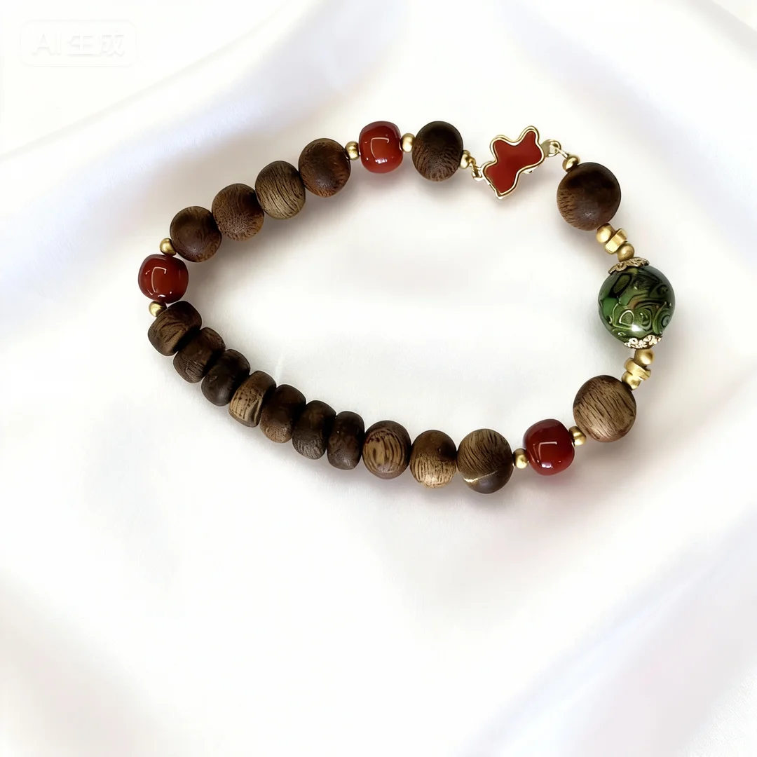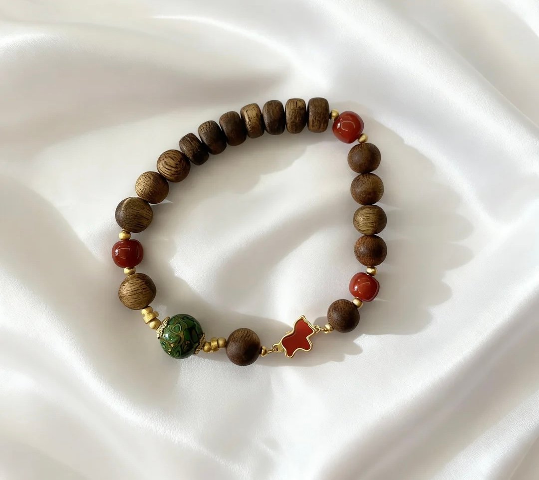 Agarwood Horse Joy Bracelet. With kynam agarwood as its backbone, it condenses the fragrance of time to calm the mind and soothe the spirit; a green lacquer bead adorns the wrist, holding the charm of oriental lacquer art and gathering blessings and auspiciousness; three southern red agate beads add color, containing the red charm of cinnabar to attract wealth and boost luck; the little red horse ornament adds a vivid touch, carrying the auspicious meaning of “success at first try”, blessing the wearer with a smooth road ahead, accompanied by joy, and the fulfillment of all endeavors.