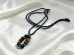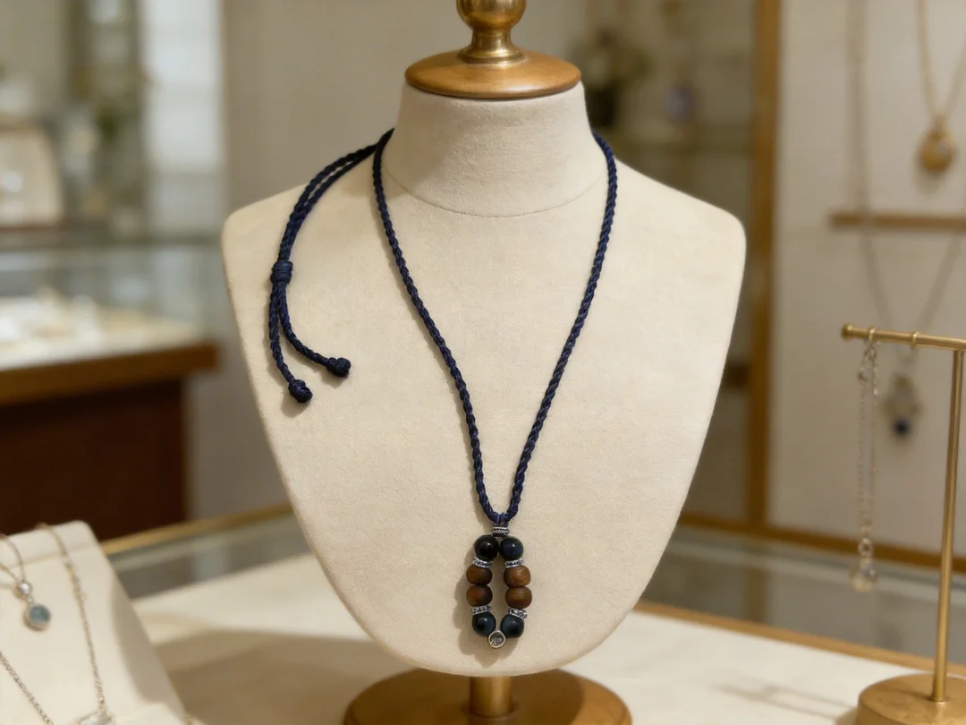 Hand-woven with azure dragon-scale patterns, this necklace inherits the essence of Oriental craftsmanship, exuding robust timeless charm in every intricate thread. It features deep, velvety Blue Tiger’s Eye Crystal beads paired with mellow Kynam Agarwood pendants—creating a striking contrast between the gem’s vivid luster and the wood’s subtle warmth. The Blue Tiger’s Eye shimmers like starlit clouds, while the Agarwood emits a soothing, elegant fragrance. Together, they craft a poised, understated Oriental aesthetic around the neck. Every woven detail is a tribute to tradition, embodying profound elegance in every stitch.