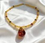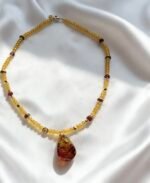 This sunlit choker is strung with warm, honey-hued citrine crystals, accented by polished Kynam Agarwood drum beads and rich crimson Czech crystals, culminating in a luminous, freeform amber pendant that catches the light like captured sunlight.