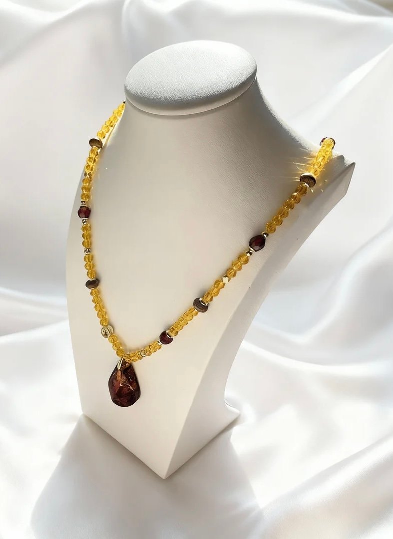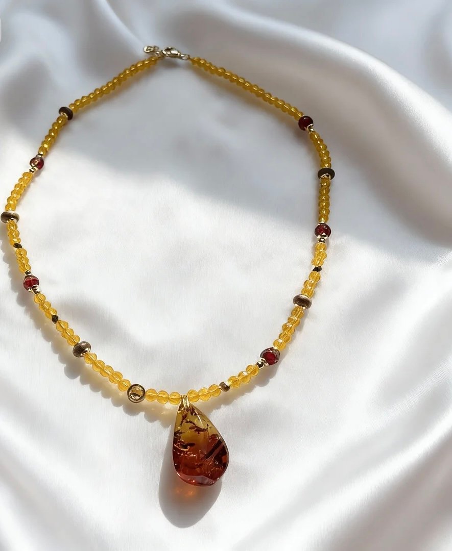The earthy warmth of Kynam Agarwood balances the vibrant sparkle of citrine and the deep pop of red, while the amber pendant adds a touch of ancient allure. Lightweight yet eye-catching, it brings a sense of golden-hour radiance to every wear, making it a perfect blend of nature’s treasures and artisanal craft.