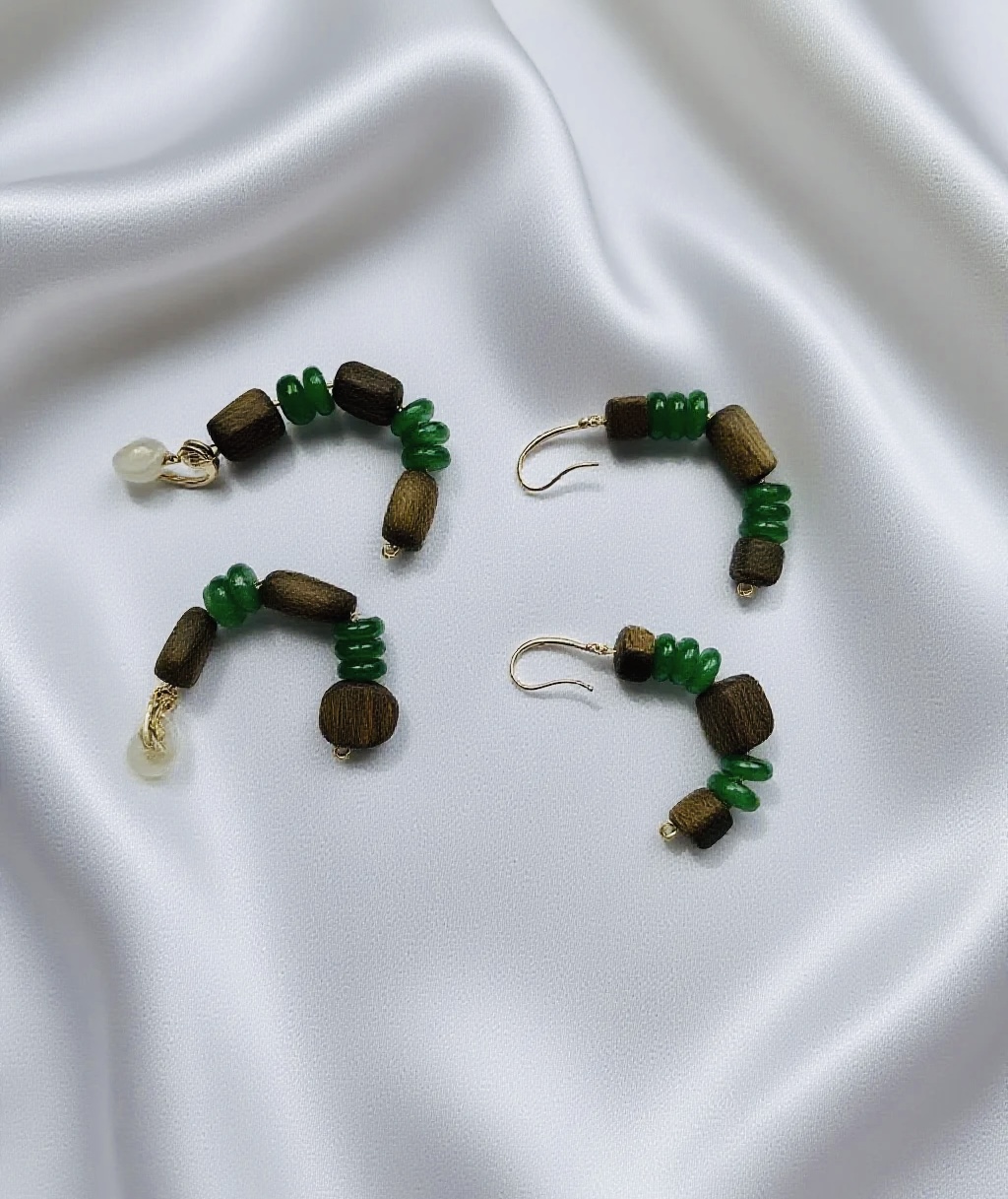 This pair of ear strings skillfully combines irregular-shaped agarwood beads with jade abacus beads, creating a unique charm of primitive elegance. The irregular-shaped agarwood beads have a natural and casual form with a warm texture; when you get close, you can smell a faint natural woody fragrance, which holds the fresh aura of mountains and forests. The jade abacus beads, on the other hand, are round and neat, with a lustrous and transparent color and a smooth touch.