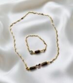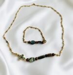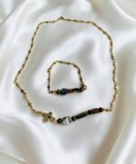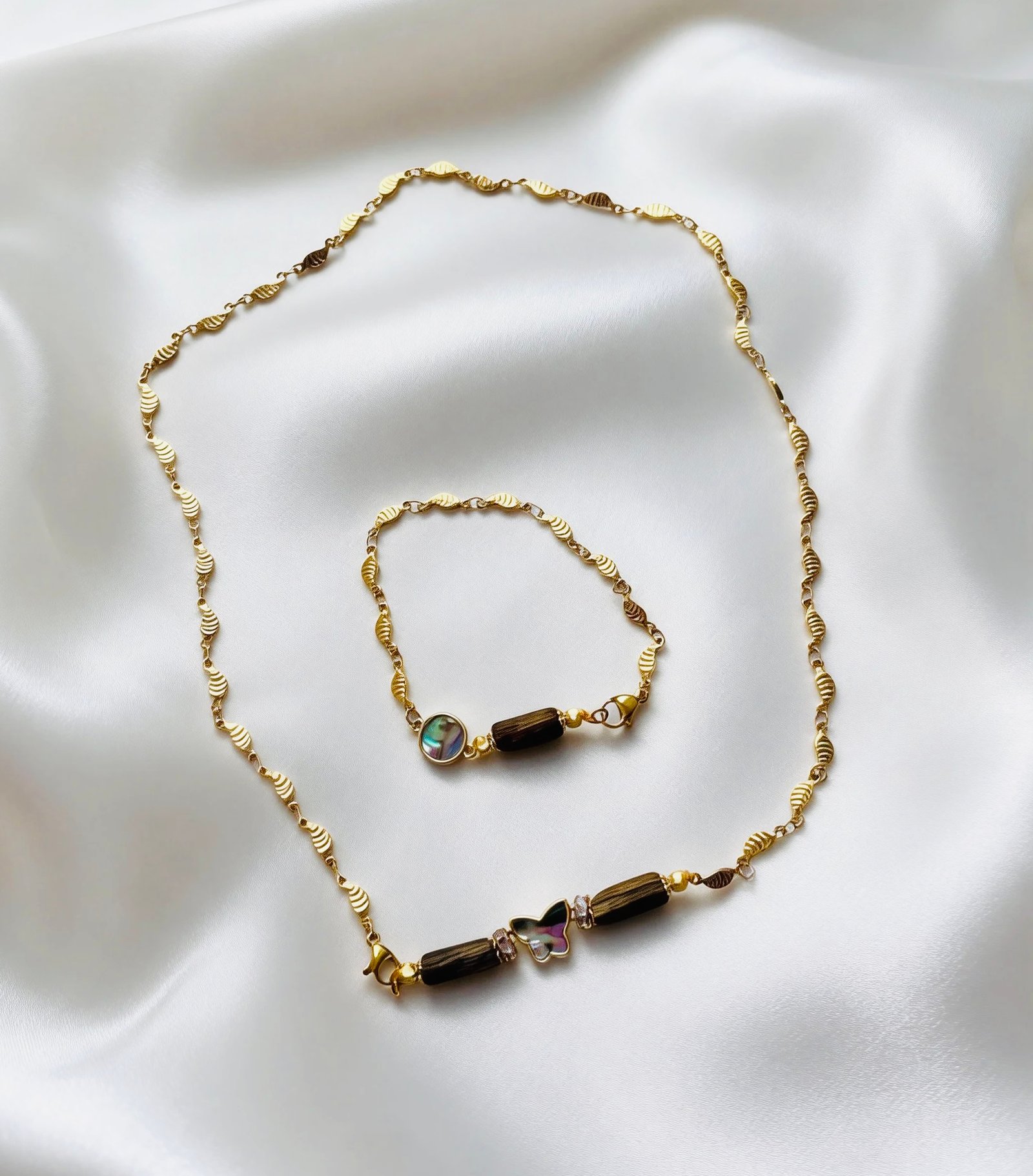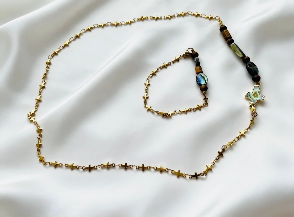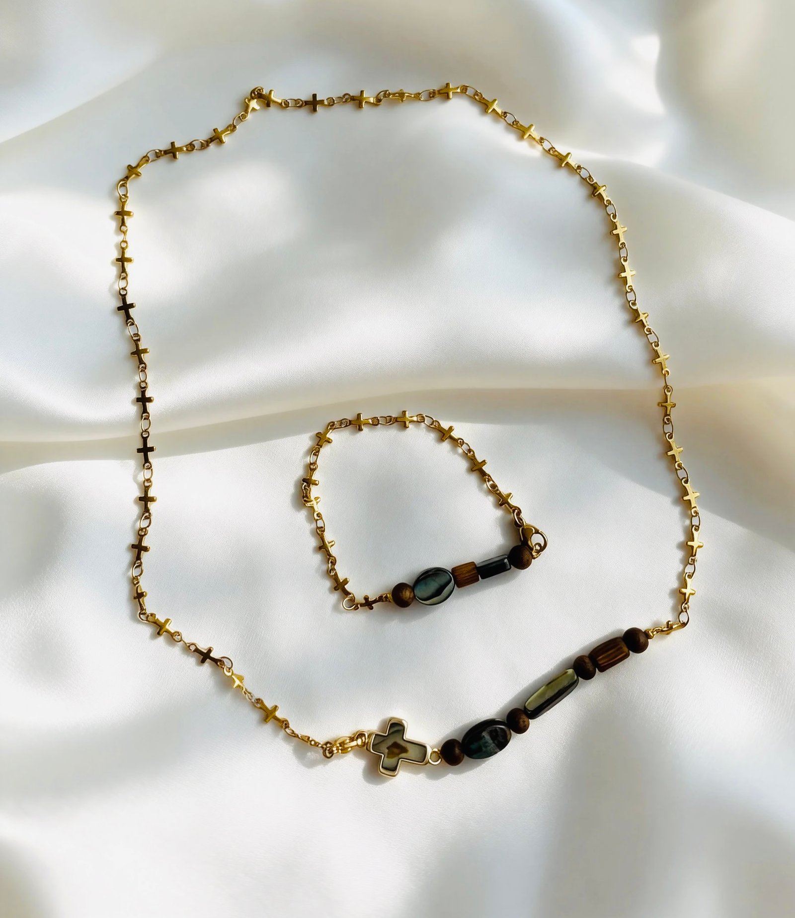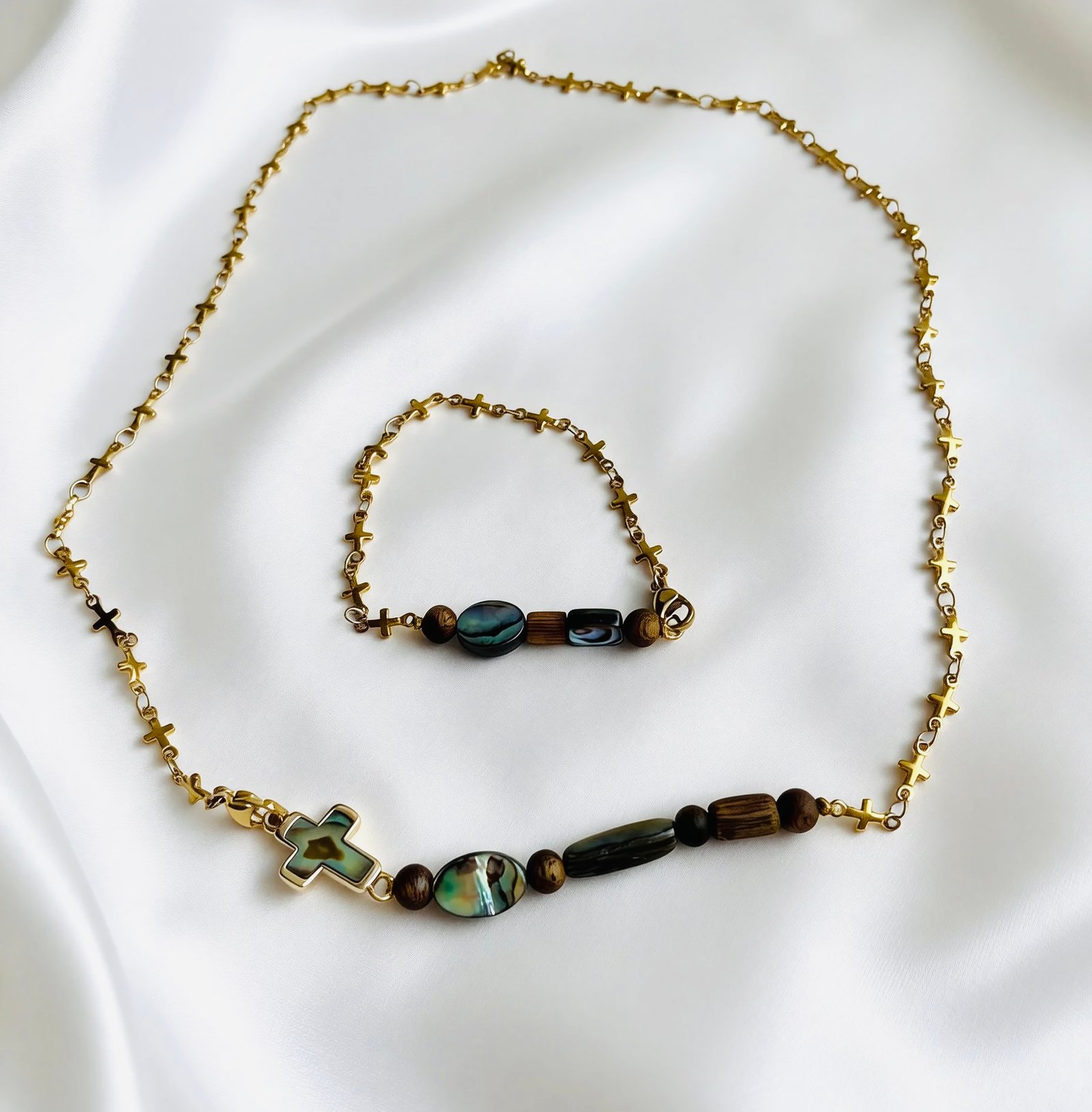 This necklace and bracelet set features a gold stainless steel chain adorned with delicate cross charms, exuding a refined vintage vibe. It is paired with iridescent abalone shell pieces that shimmer with rainbow hues, balanced by the warm, natural aroma of Kynam Agarwood beads.