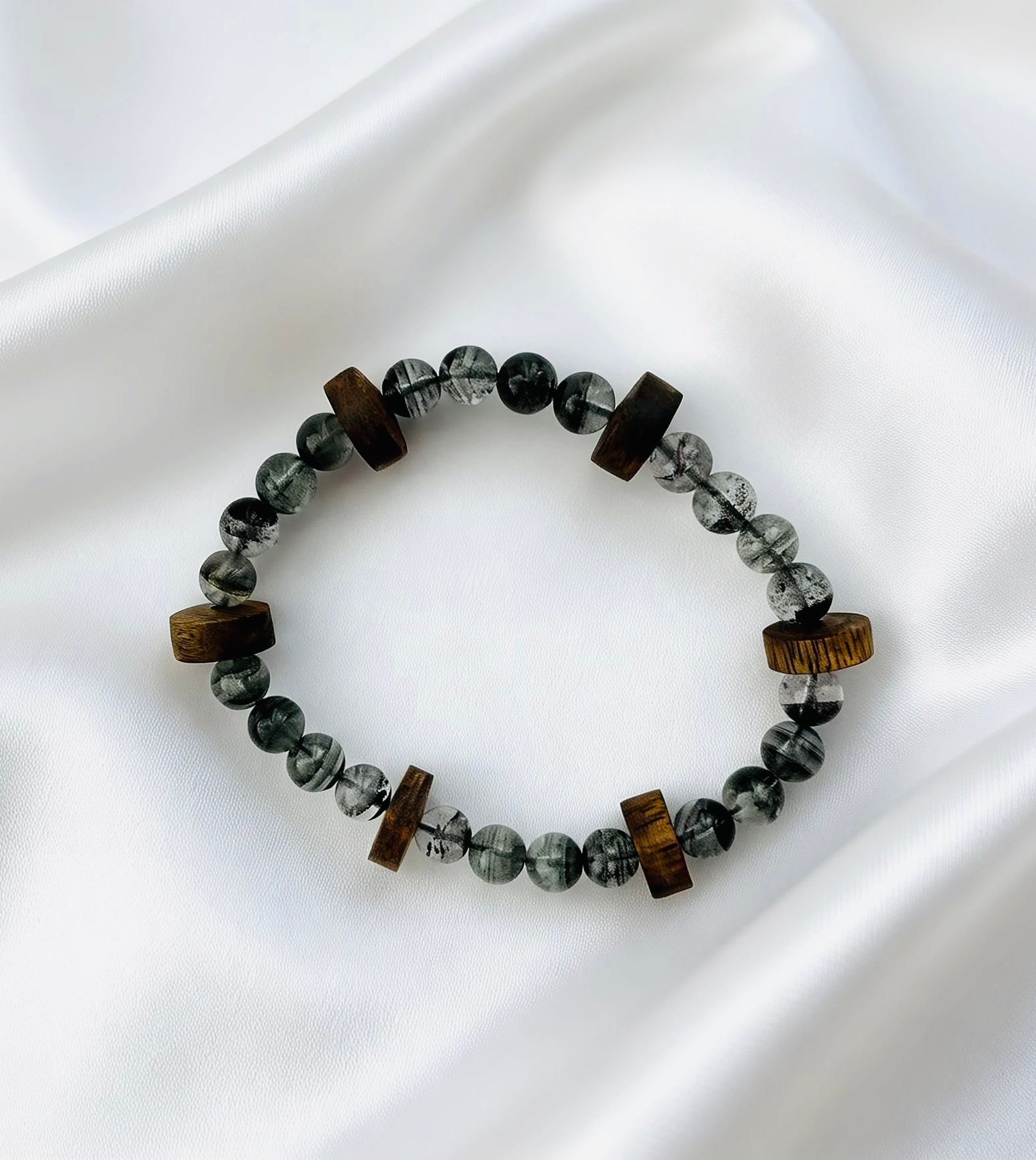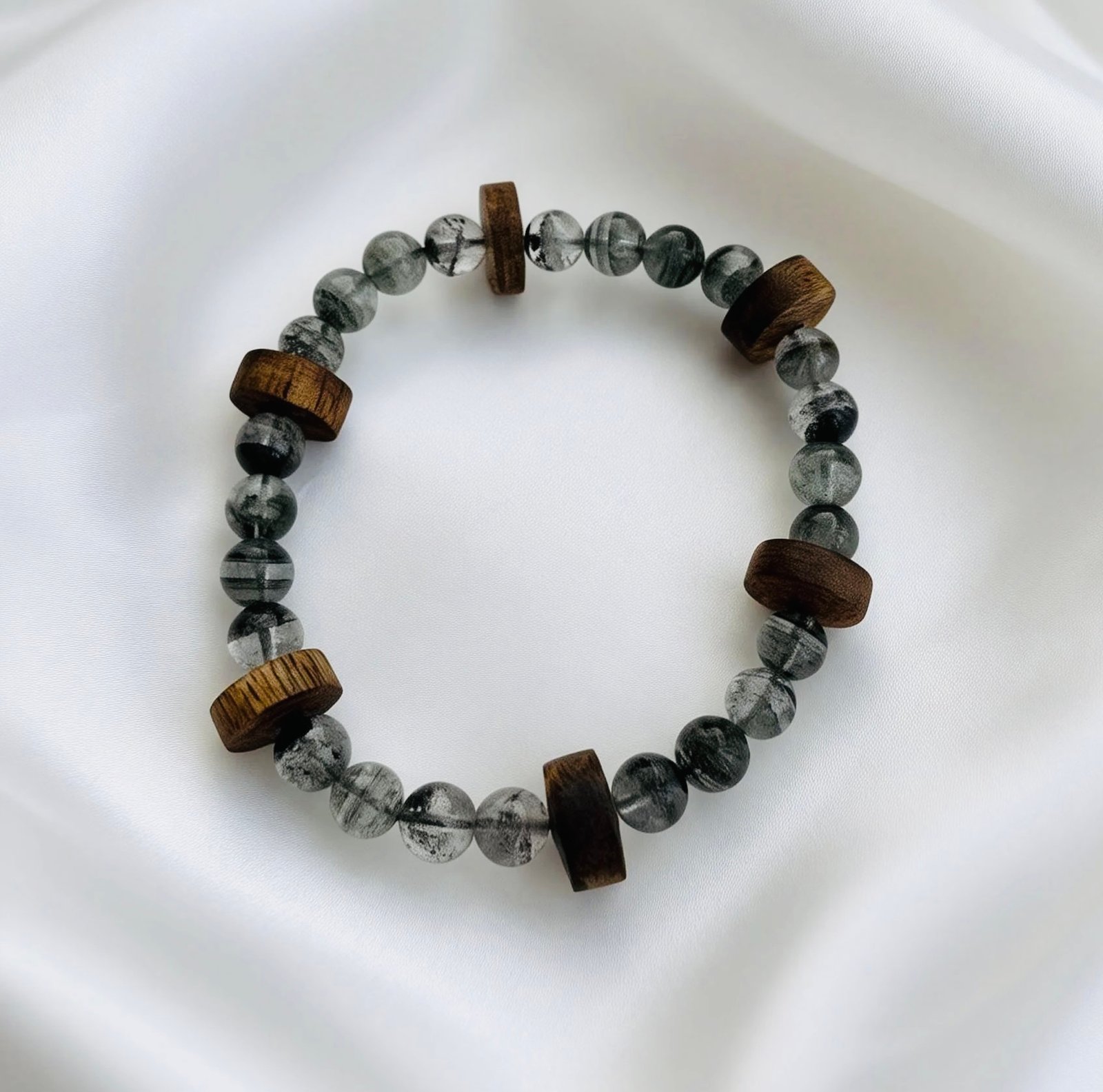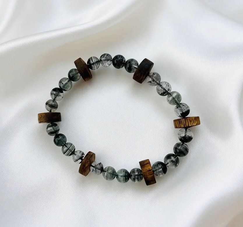 Translucent green phantom quartz beads hold the misty allure of mountain forests, interwoven with mellow Kynam Agarwood abacus beads that carry a natural woody aroma, creating a relaxed Eastern elegance on your wrist. The abacus beads symbolize fortune and prosperity, while green phantom quartz represents wealth and opportunity. The rich scent of agarwood complements the crystal’s fresh green hues, making it both a refined daily accessory and a personal token of traditional Chinese blessings.