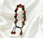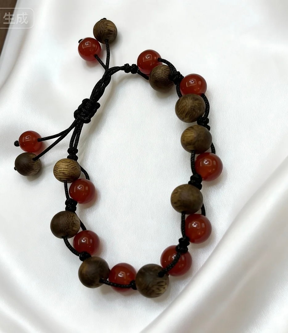 A handwoven bracelet crafted from 0.8cm Kynam Agarwood beads and vivid red crystal beads, threaded together with sleek black cord. The deep black of the cord mimics the gnarled lines of winter branches, while the rich, earthy texture of Kynam Agarwood pairs perfectly with the bright, translucent glow of red crystals—each red bead like a plump holly berry clinging to the branch.