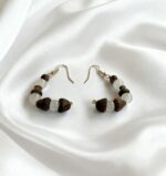 The irregular-shaped beads of Kynam agarwood boast a unique texture, paired with the translucent and luminous white moonstone cylindrical agates, together outlining the distinctive silhouette of the C-shaped earrings.