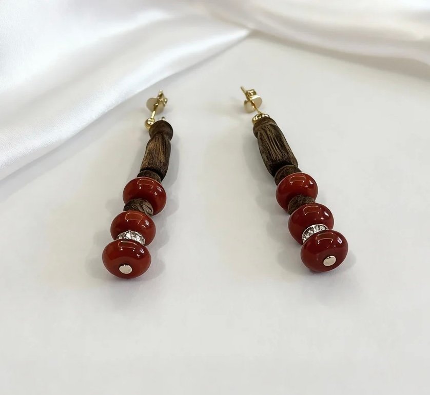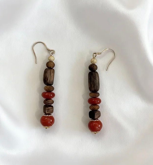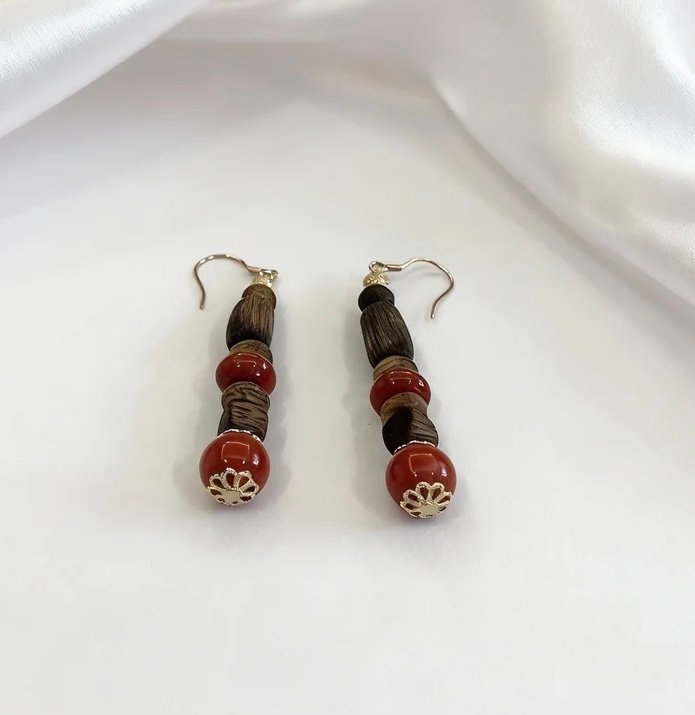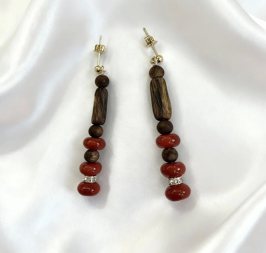 These earrings feature natural Kynam Agarwood beads as their core, with rich wood grain carrying a lingering aroma, paired with vibrant red agate that blends the warmth of Eastern wood with the brightness of jade.