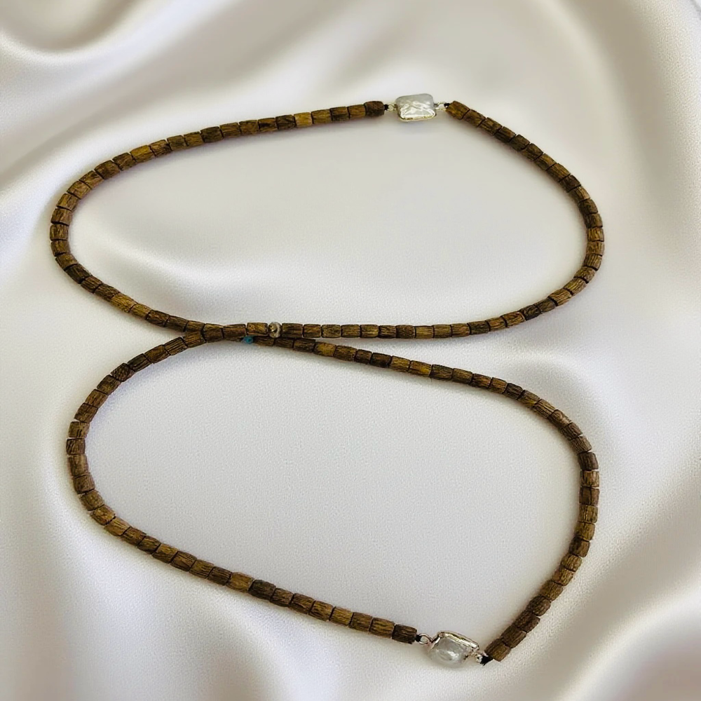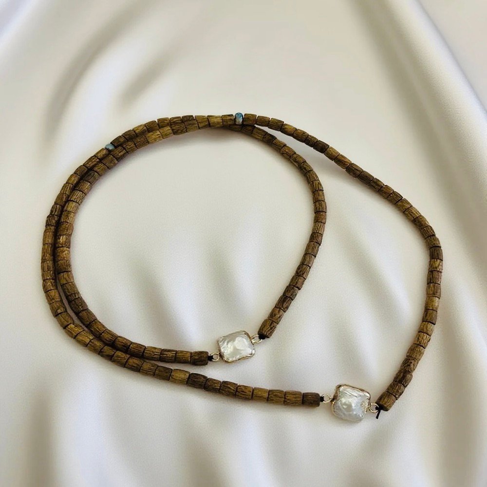 The baroque pearl square pendant paired with agarwood barrel beads creates a striking blend of rustic charm and warm elegance. Each detail radiates grace and intellect. Unlike traditional round pearls, the square pendant features natural irregular textures beneath a soft pearly glow that shifts from faint pink to creamy white, reminiscent of moonlight. Its slightly rough edges retain a natural ruggedness that complements the calm, steady agarwood beads.