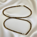 The agarwood barrel beads feature a classic rustic texture with a neat, cylindrical shape and a delicate oily sheen, as if aged by time. Their deep brown base reveals varied patterns, accompanied by a subtle, elegant fragrance. Wearing them evokes tranquility and refinement. The soft pearly glow of the pearl complements the warm wooden texture of the agarwood, creating an understated yet sophisticated beauty that exudes composure and elegance.