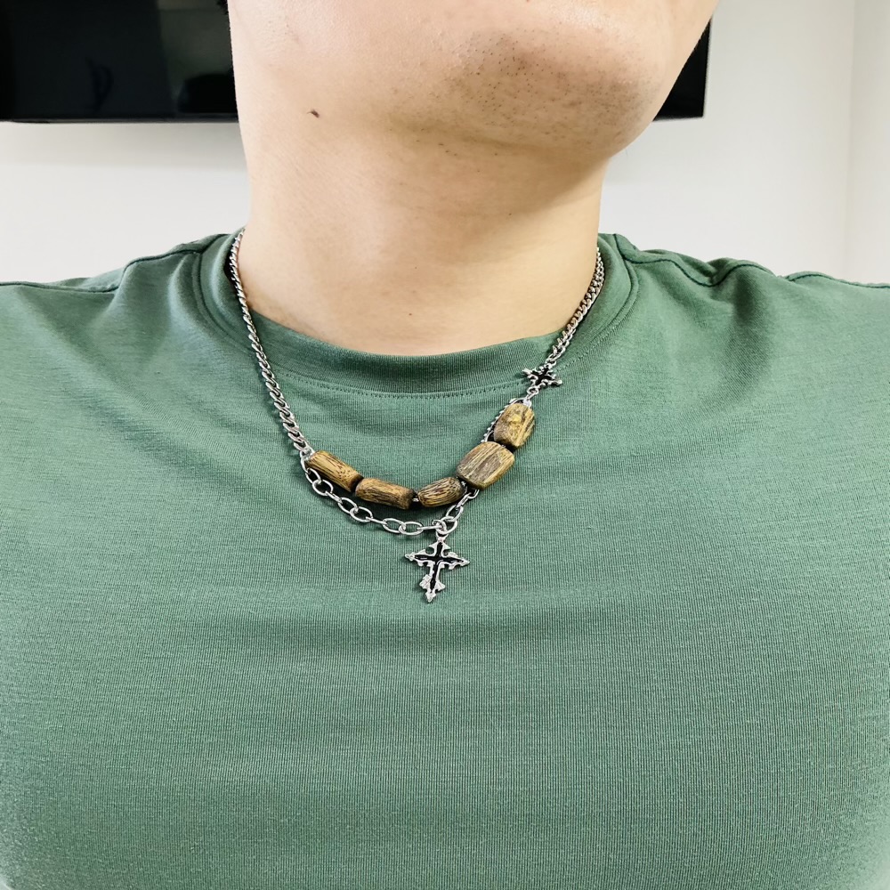 Men’s popular steel chain necklaces, with their rugged metallic texture, naturally exude a strong sense of trendy coolness. When paired with a rectangular agarwood bead, the necklace instantly gains a touch of understated elegance and calmness. The warm wooden tones and natural grain of the agarwood bead seem to carry the weight of time, creating a striking yet harmonious contrast with the steel chain’s sharpness. It also subtly reveals a unique refined style, adding depth and character to the overall look. This combination effortlessly complements various fashion styles, whether casual and laid-back daily wear or occasions with a bit of personality, making it a perfect finishing touch.