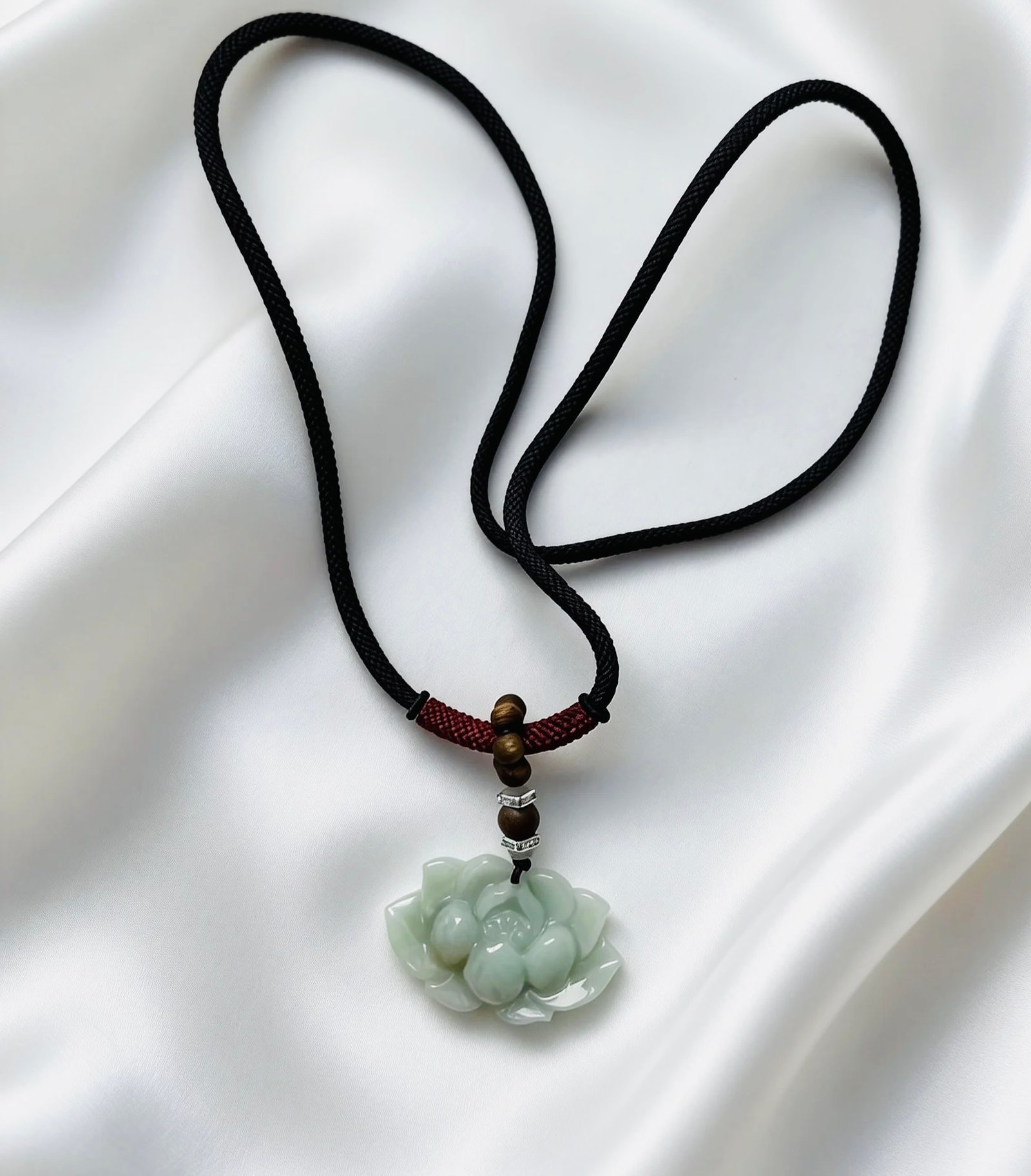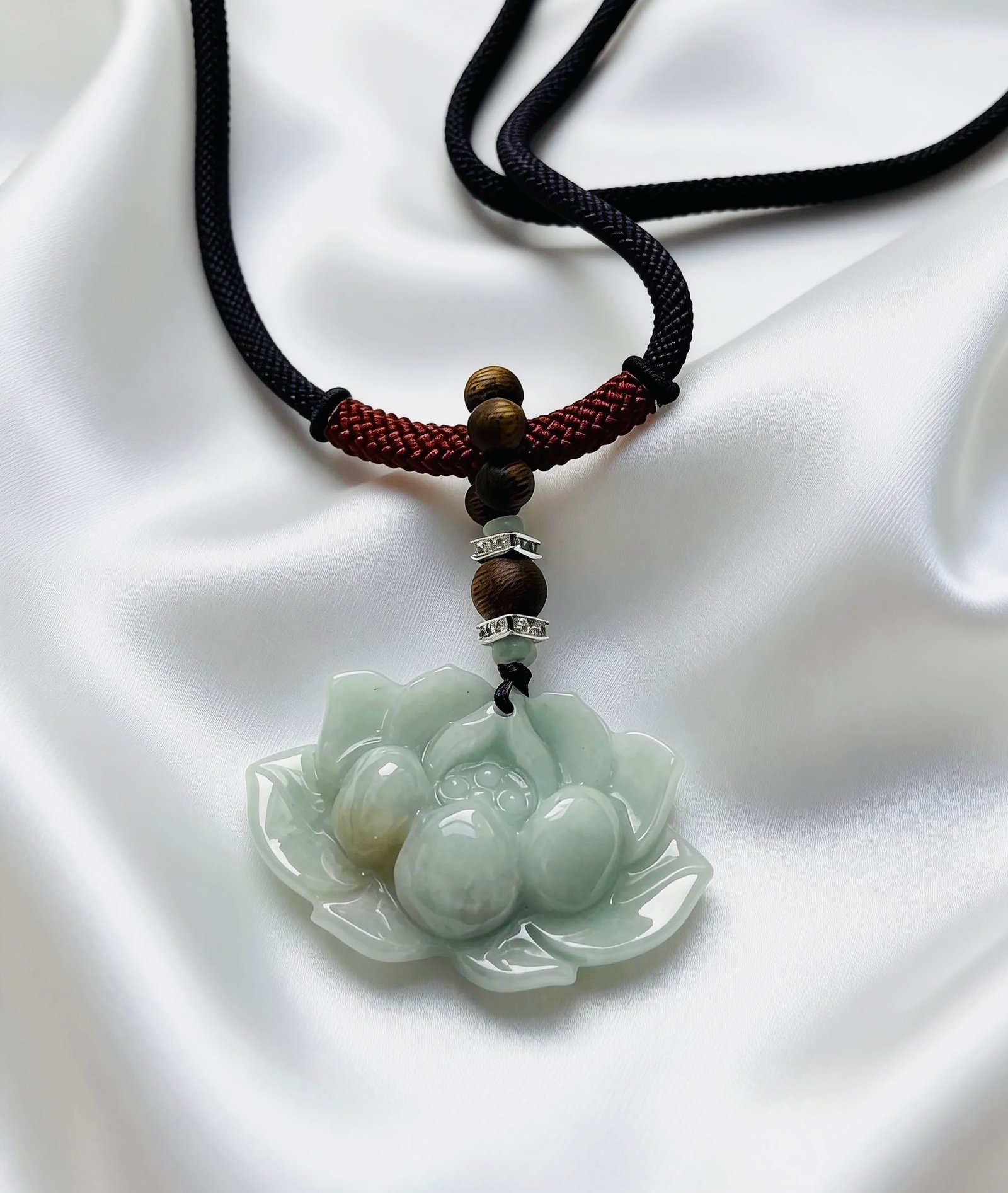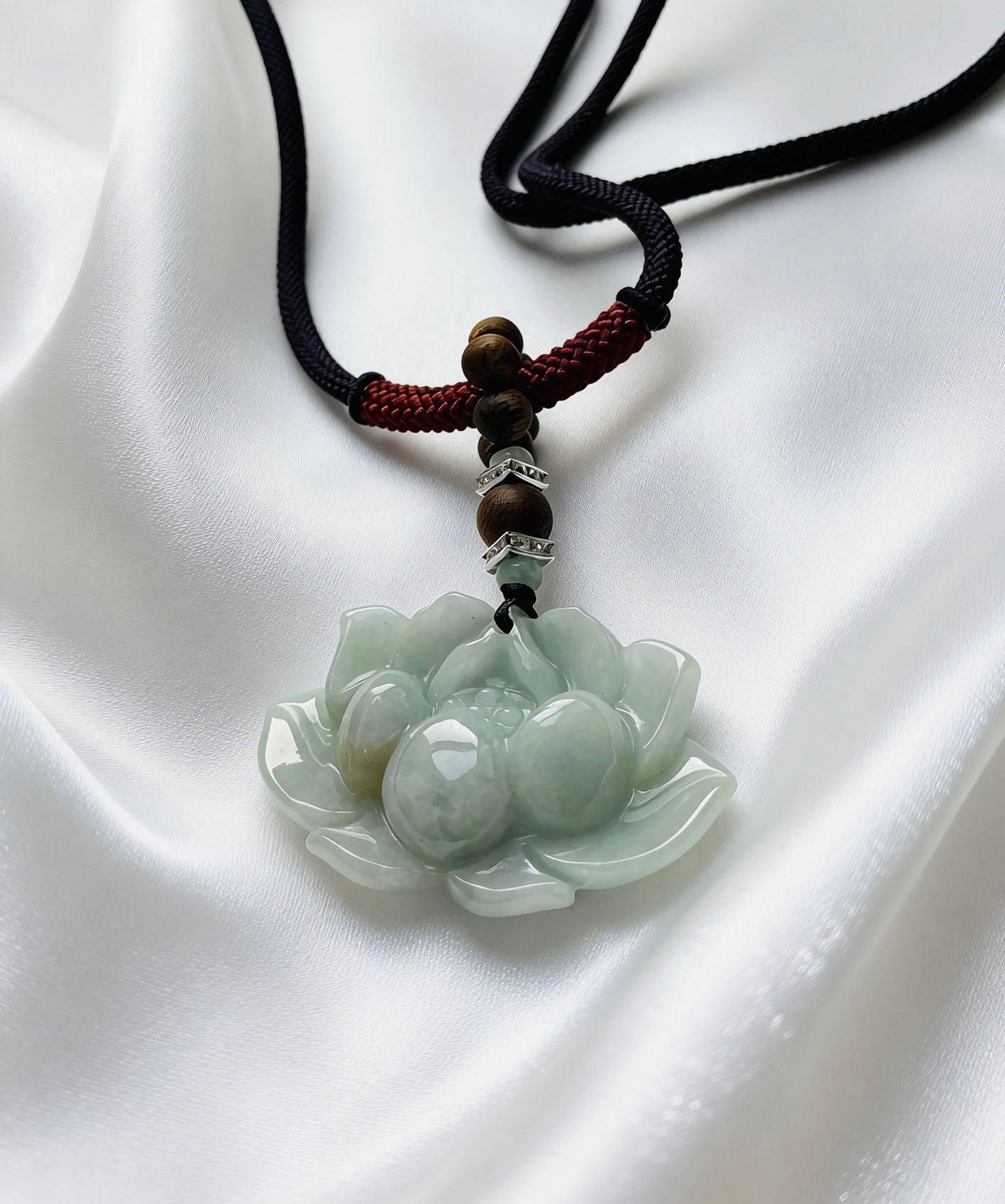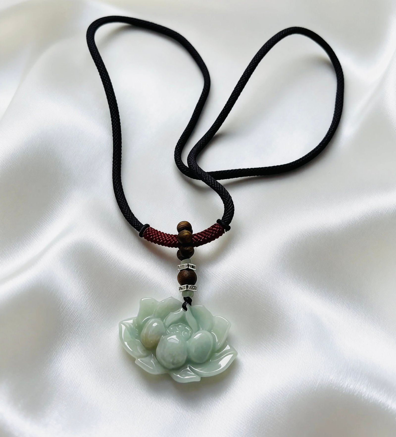 Crafted with a thick, hand-woven deep purple cord that exudes a calm, understated elegance, this necklace features a ring of Kynam Agarwood beads releasing a gentle, lingering aroma, holding a jade lotus pendant. The warm translucency of jade blends with the serene scent of agarwood, creating a minimalist yet deeply tranquil piece that captures the grace of a lotus pond and the peace of the forest. It is a personal talisman that embodies Eastern zen and refined sophistication.