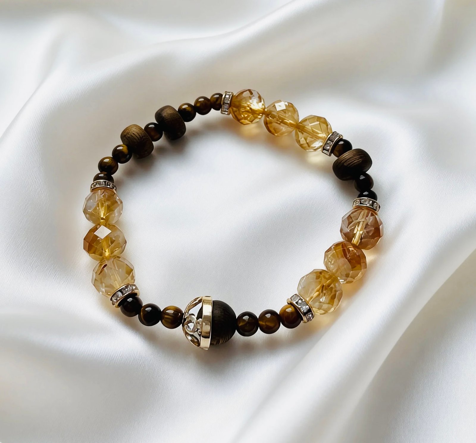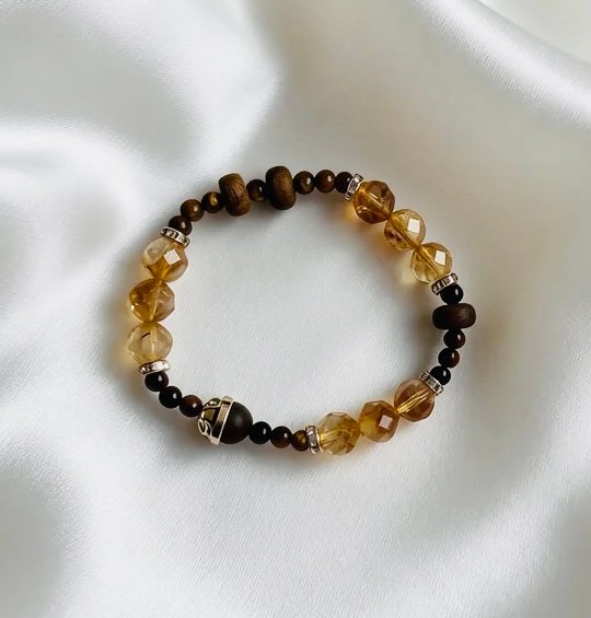 Faceted orange citrine beads glow with a warm, honeyed radiance, like maple syrup trickling down autumn branches. They are paired with delicate tiger’s eye beads and accented with Kynam Agarwood beads, blending the sweetness of nature with the calm warmth of wood. Sparkling diamond-encrusted metal spacers add a touch of luxury, creating a cozy, inviting vibe that captures the gentle beauty of an autumn forest.