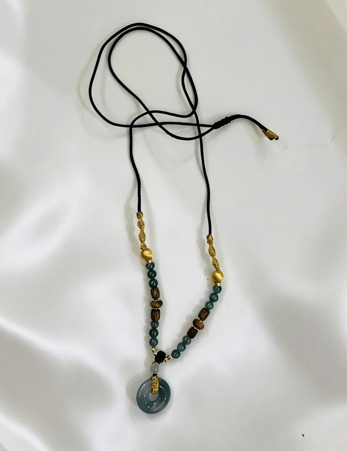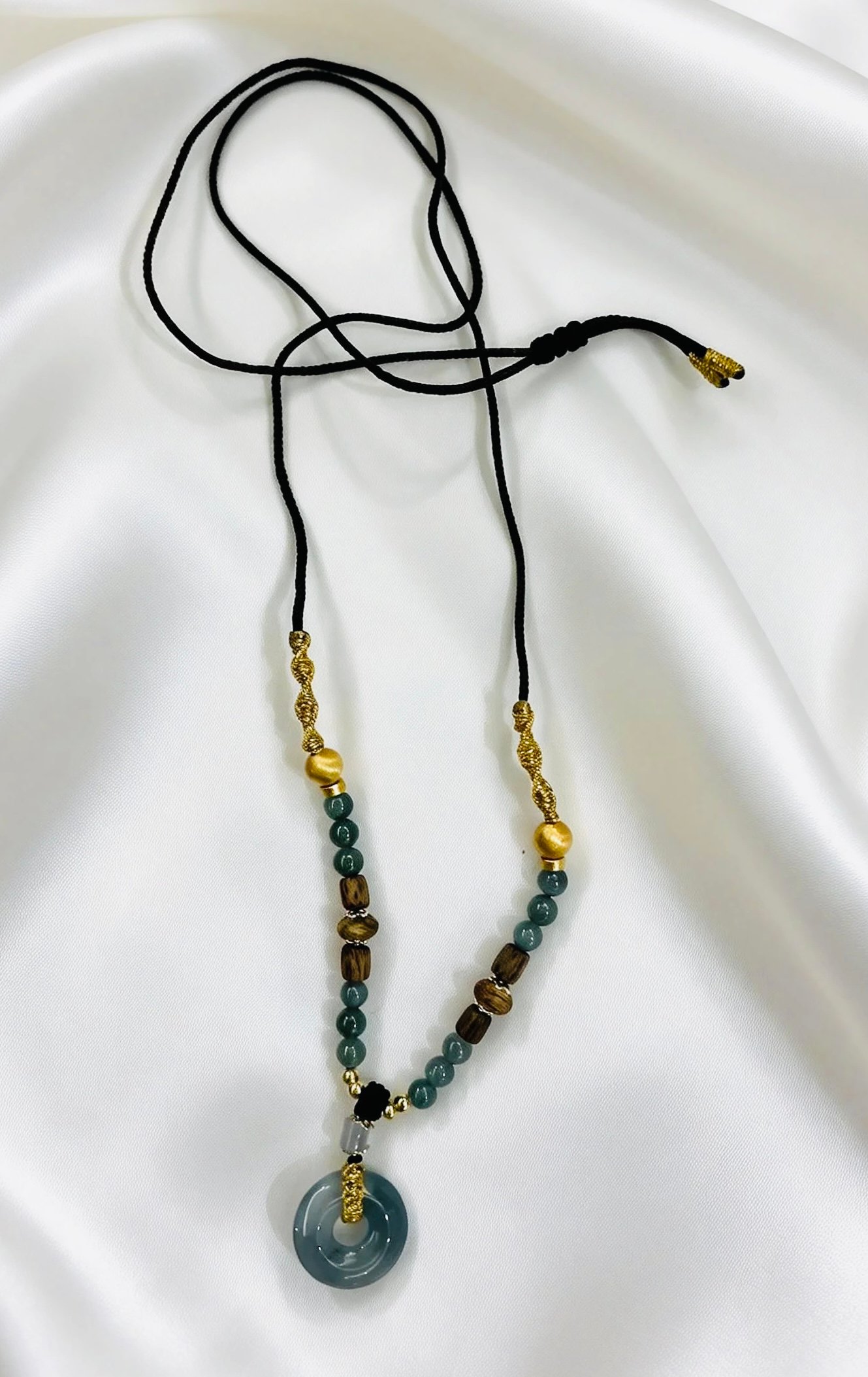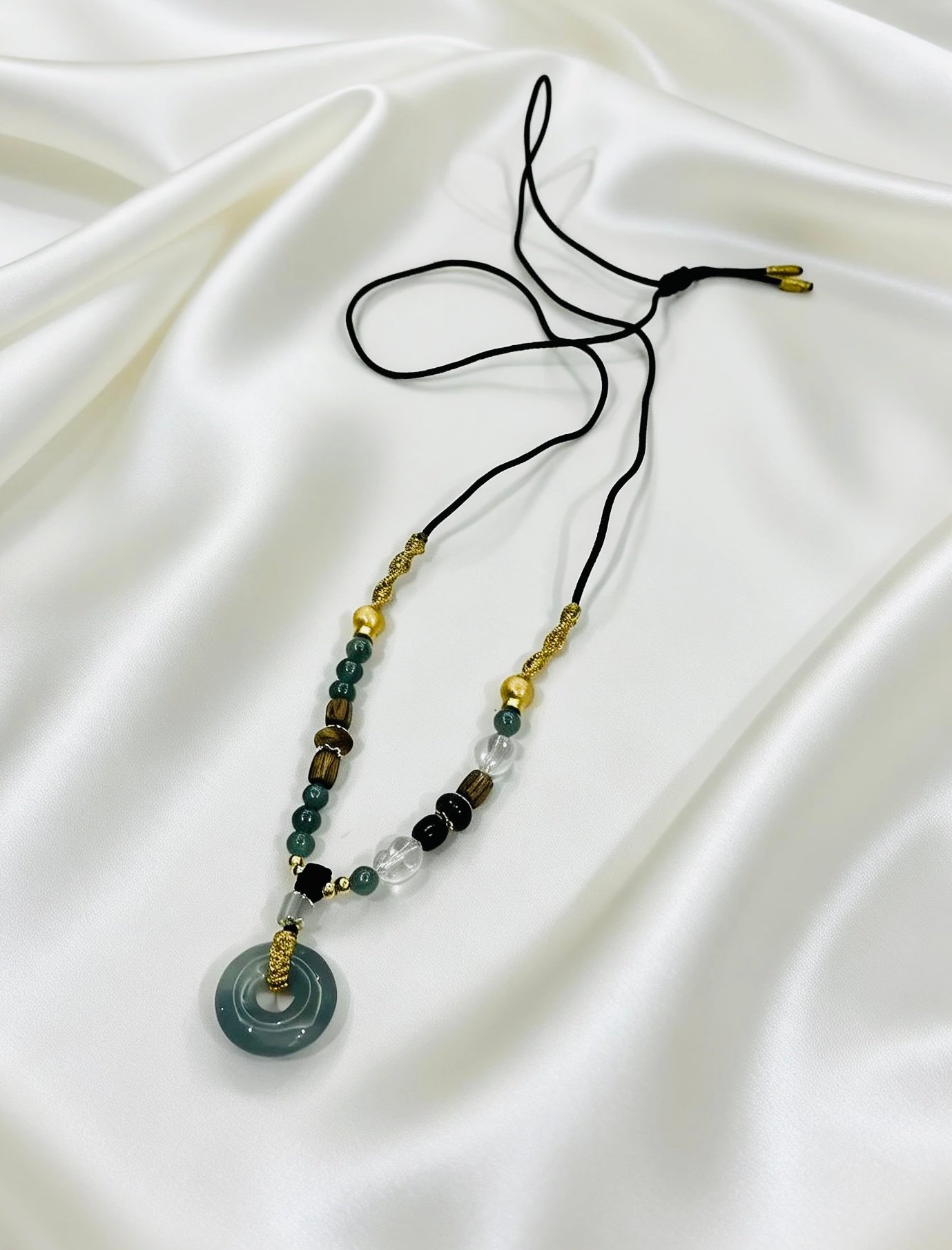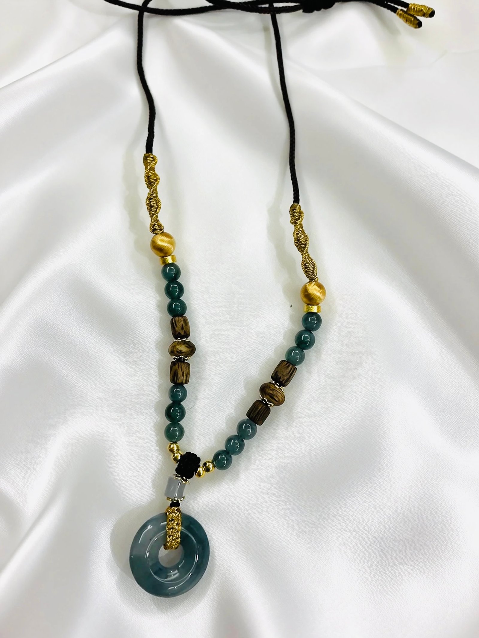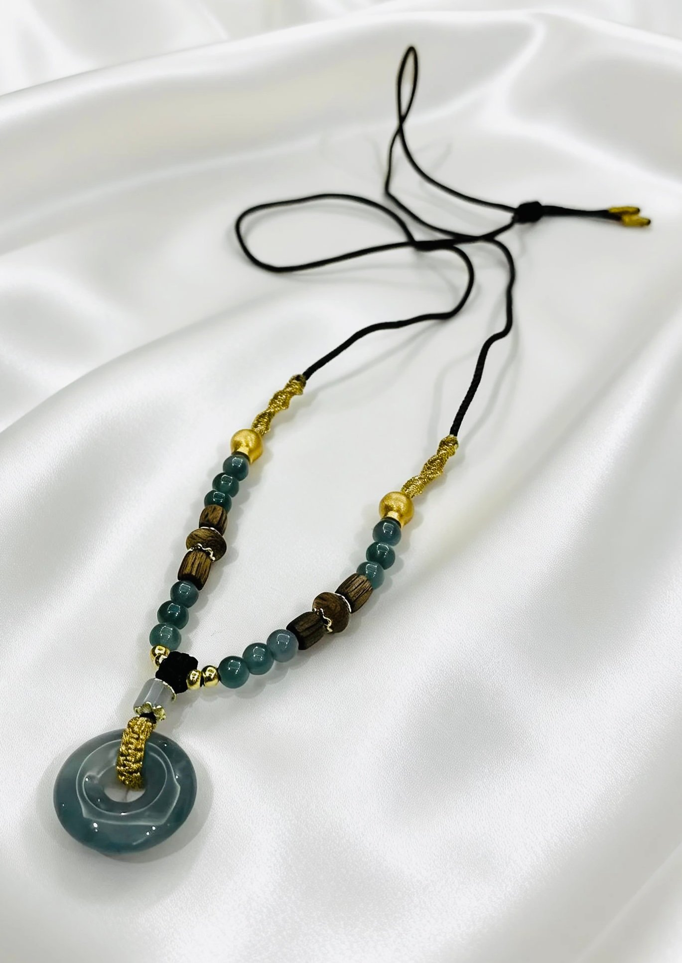A delicate hand-woven cord links the essence of Eastern elegance. Jadeite beads evoke mist-shrouded green mountains at dawn, while the rich, woody scent of Kynam Agarwood lingers gently around the neck. Gilded spheres add a subtle touch of luxury, and the smooth jadeite safety clasp rests like a tranquil full moon, holding the promise of peace and warmth close to your heart. More than an adornment, it is a portable piece of Eastern refinement and a constant guardian of serenity.