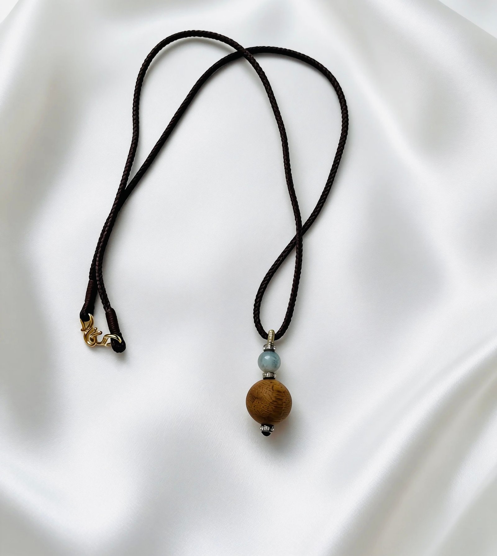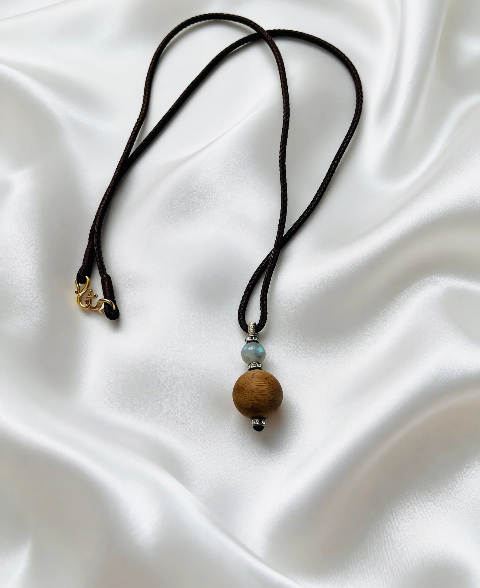 The deep brown braided cord exudes a warm, understated elegance, holding a 1.4CM Kynam Agarwood bead that releases a gentle, lingering natural aroma. Above it, a grey moonstone gemstone shimmers with a delicate adularescence, blending the calm warmth of agarwood with the soft glow of moonlight. This pendant captures the serenity of a forest night, making it a refined and meaningful accessory for everyday wear.