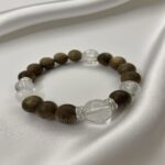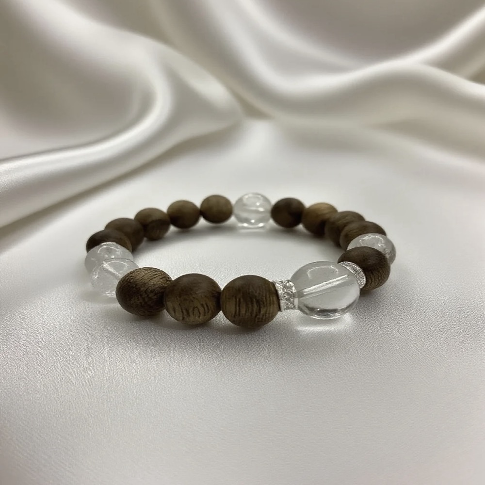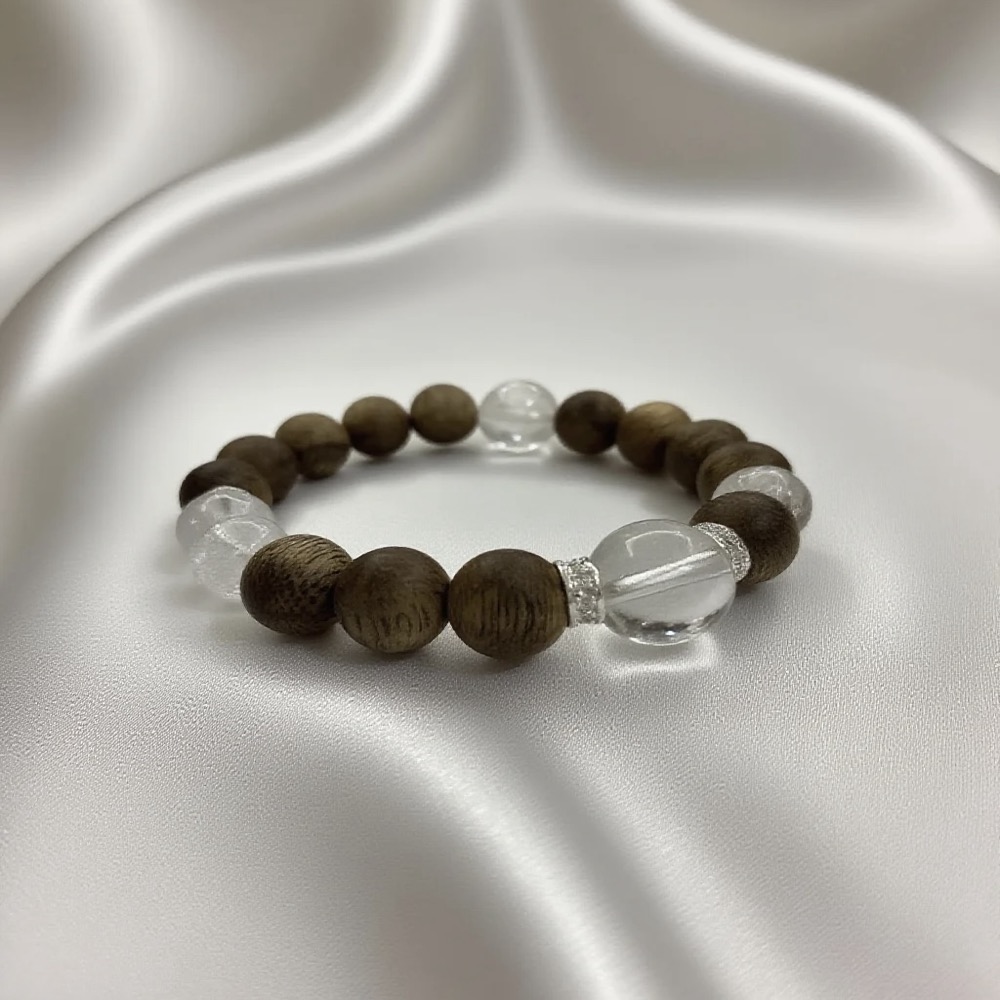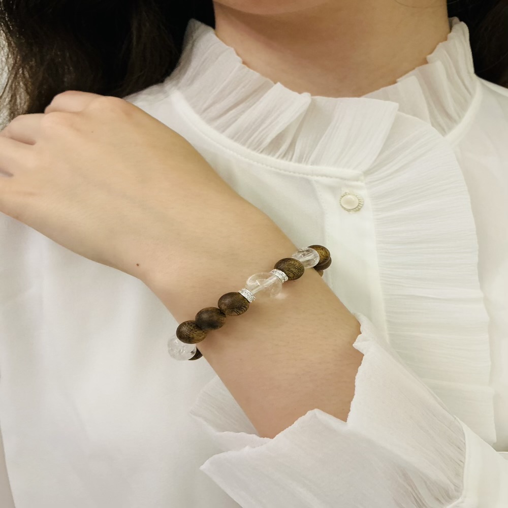 The bracelet made of agarwood water-drop beads and white Aze crystals is a poetic blend of natural charm and pure energy. The water-drop-shaped agarwood beads, like condensed dewdrops of time, carry a mild woody fragrance, just like those quietly precipitated insights in life. Every curve hides the wisdom of going with the flow, as if it can calm the inner restlessness; while the white Aze crystals are transparent and clean, shining with a clear luster, as if they can absorb the disturbances of the world and bring inner clarity and peace to the wearer. This bracelet, which combines the calmness of agarwood with the purity of white Aze crystals, seems to tell a life attitude of finding tranquility in the hustle and bustle and maintaining purity in the impetuosity. Wearing it on the wrist is a gentle comfort to talk with oneself.