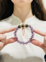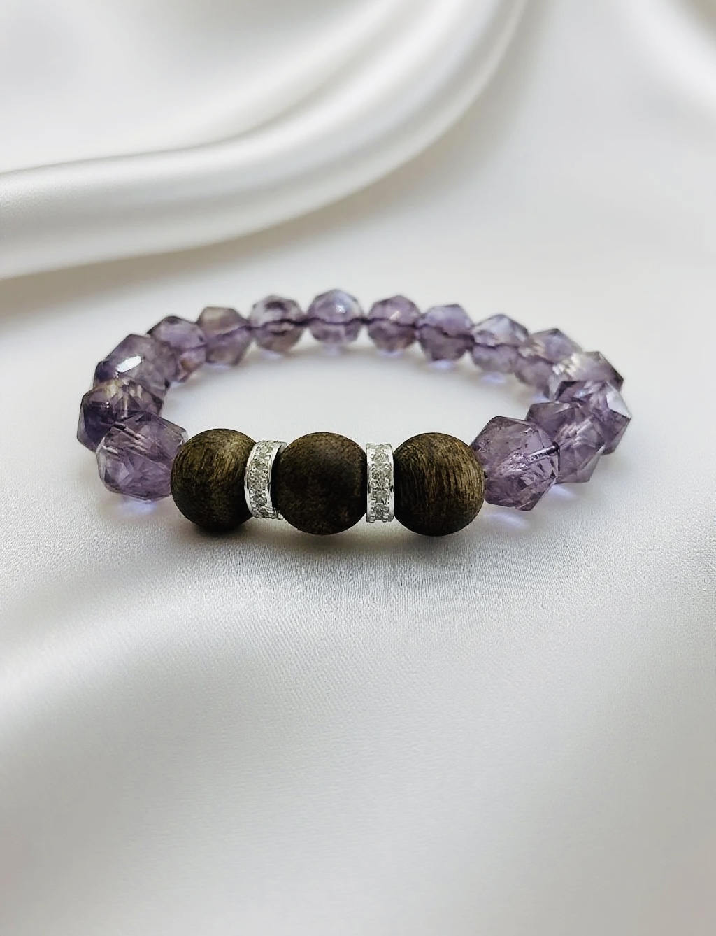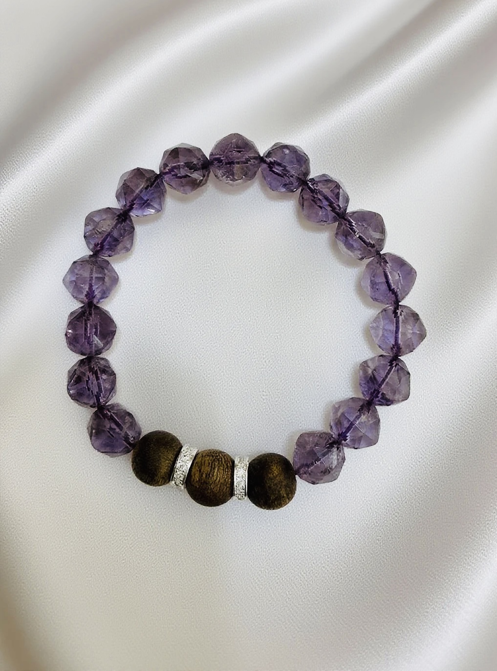 The multi-faceted cut amethyst bracelet has a natural “light-flowing magic” — each facet seems to hold tiny starlight, and when twisted, it ripples with a hazy yet brilliant purple glow. Three 1.0cm agarwood beads are subtly interspersed among them; the calmness of the warm wood and the clarity of the crystal form a wonderful dialogue. This not only balances the magnificence of the amethyst but also gives the elegant charm of agarwood a lively carrier. With every movement of the wrist, there is both the sparkle of the crystal and the hidden fragrance of agarwood.