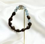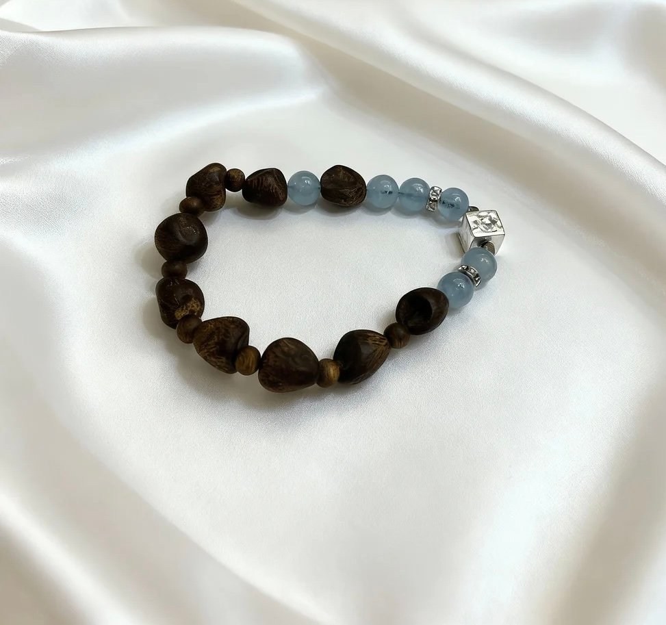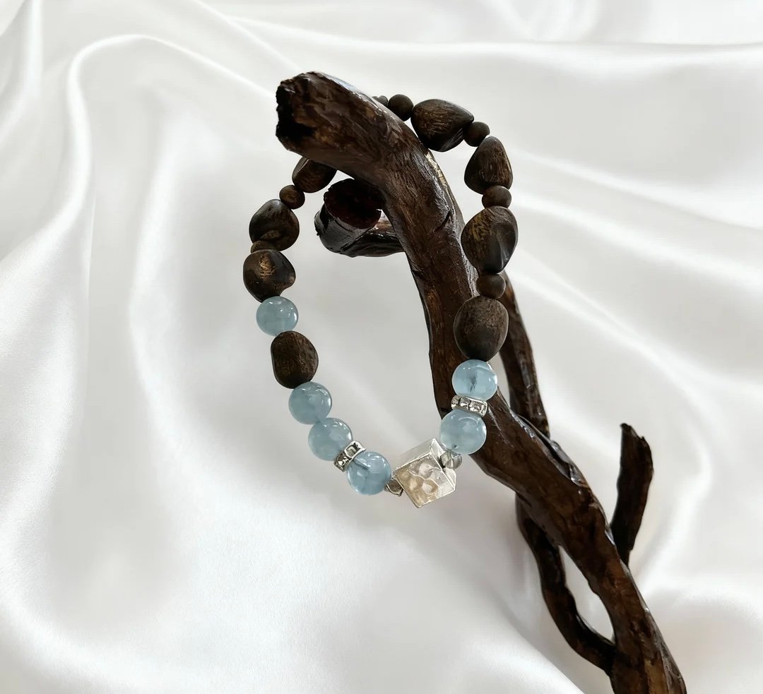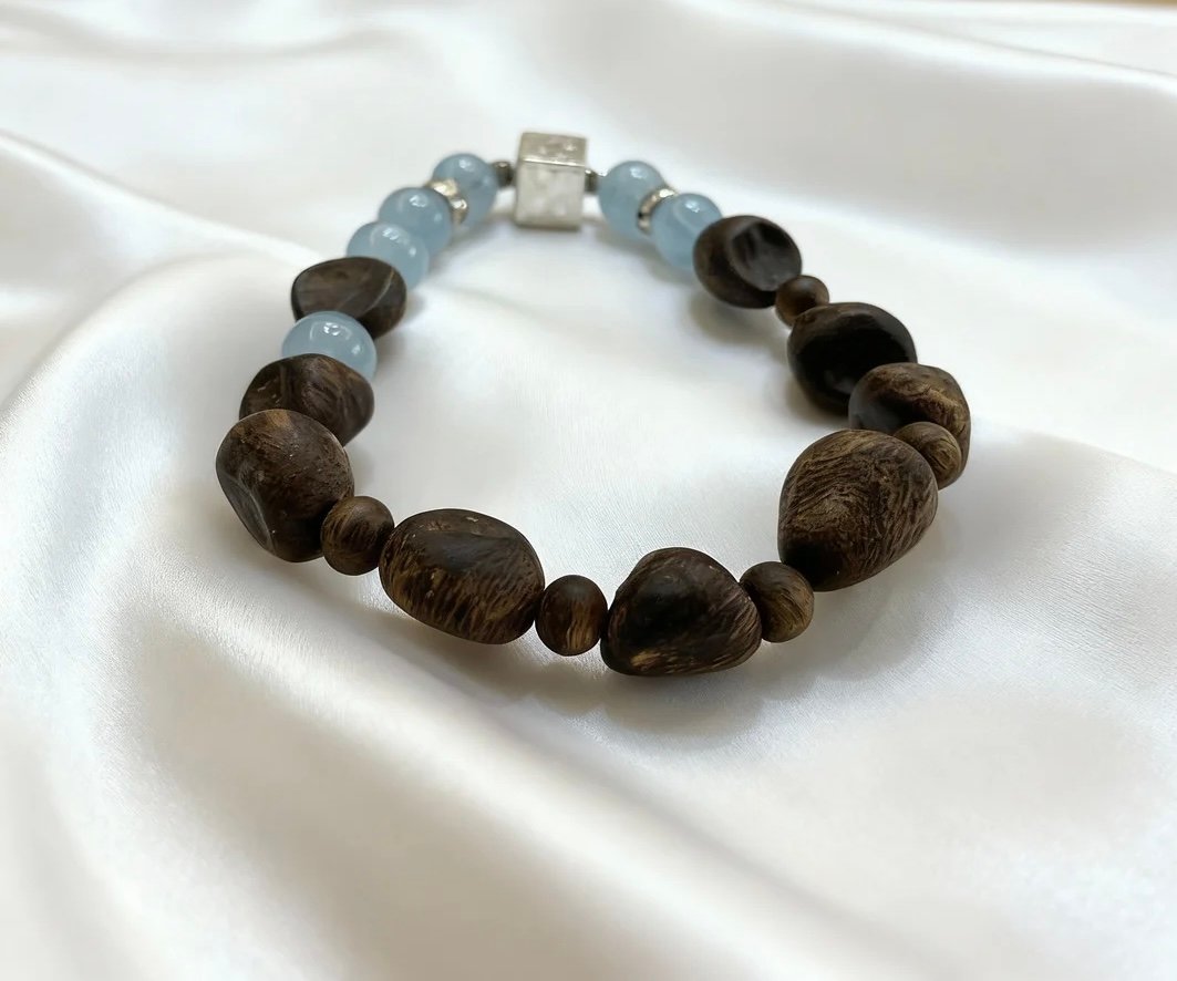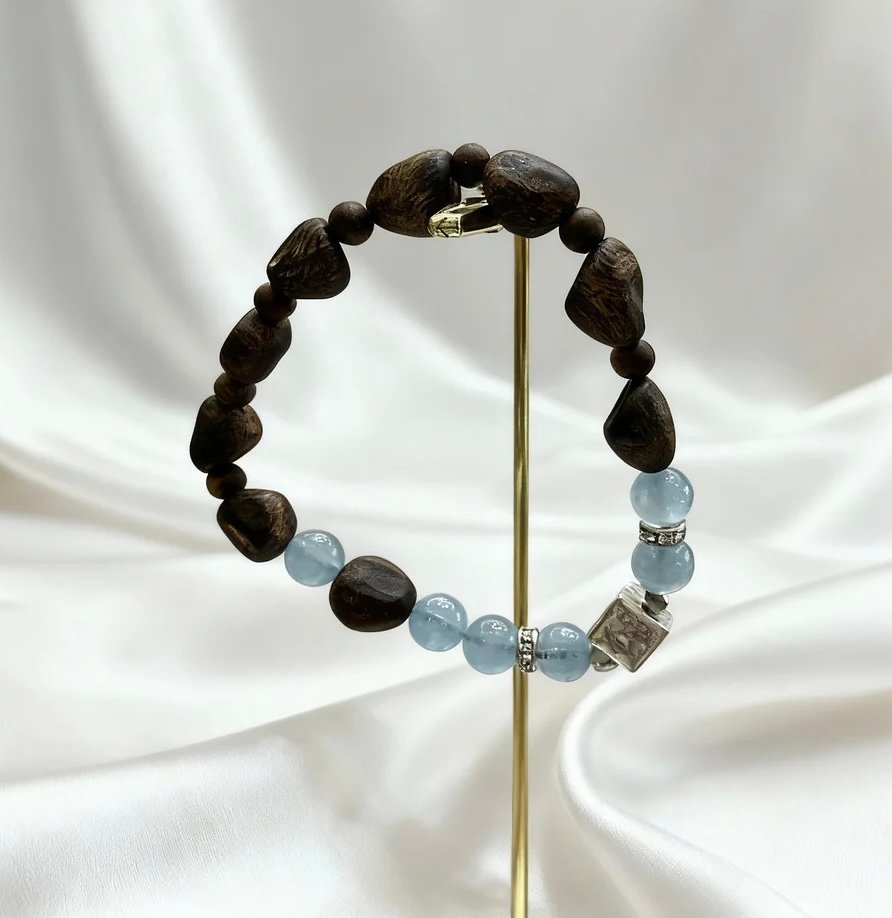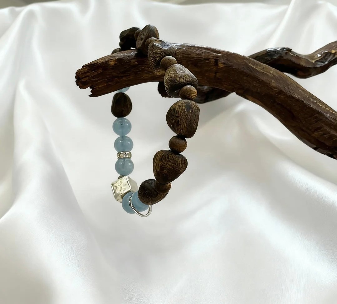 This distinctive accessory features dainty teardrop-shaped Kynam Agarwood beads paired with translucent aquamarine crystals, anchored by a handcrafted square silver centerpiece that steals the spotlight. The agarwood’s mellow, woody aroma mingles with the cool, ocean-like hue of aquamarine, while the matte texture of the hand-forged silver adds an artisanal touch, creating an overall aesthetic that is fresh, elegant and delightfully clean.