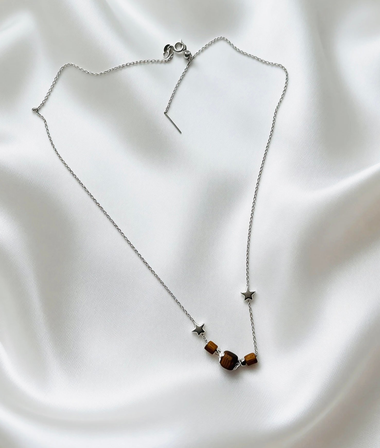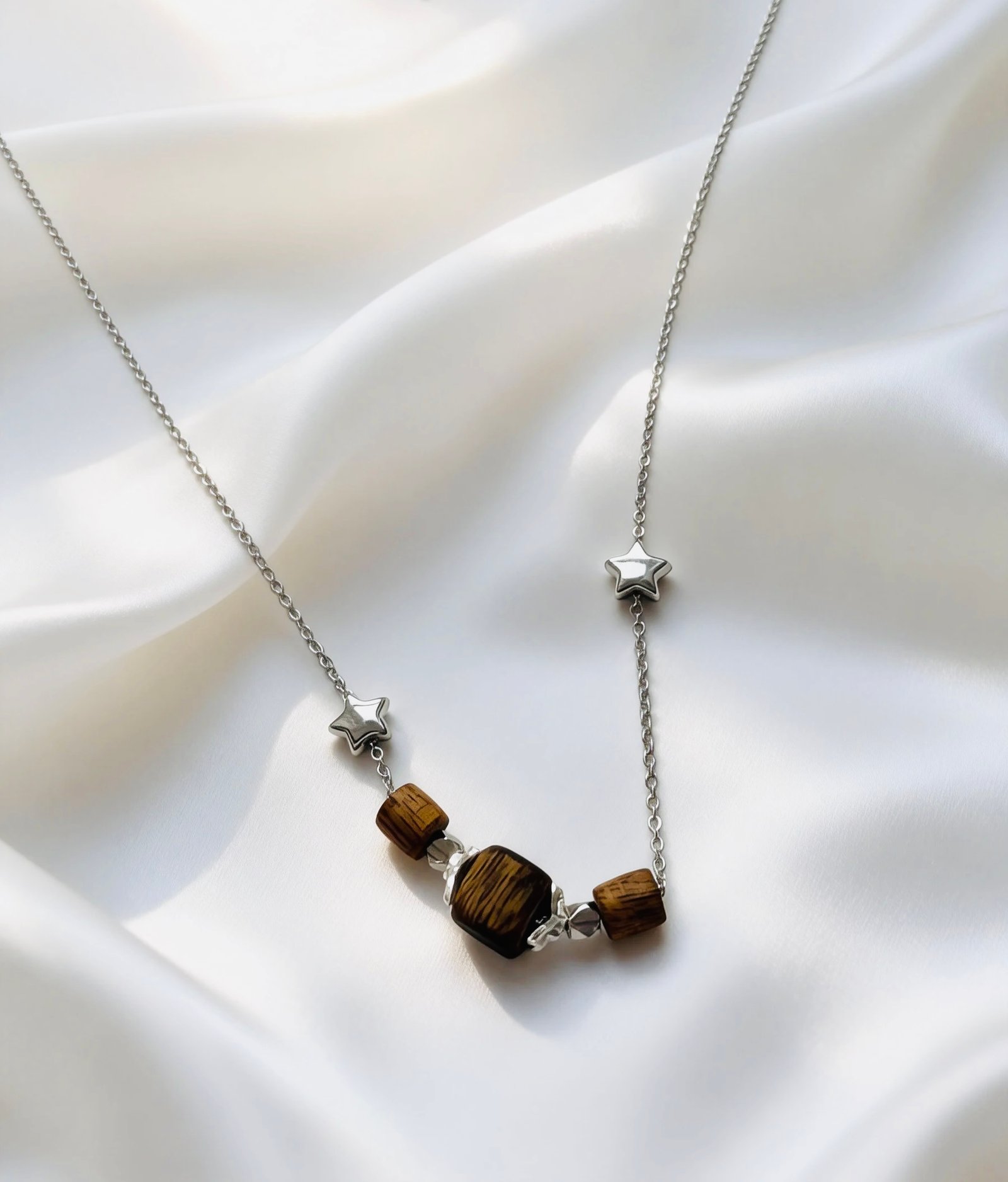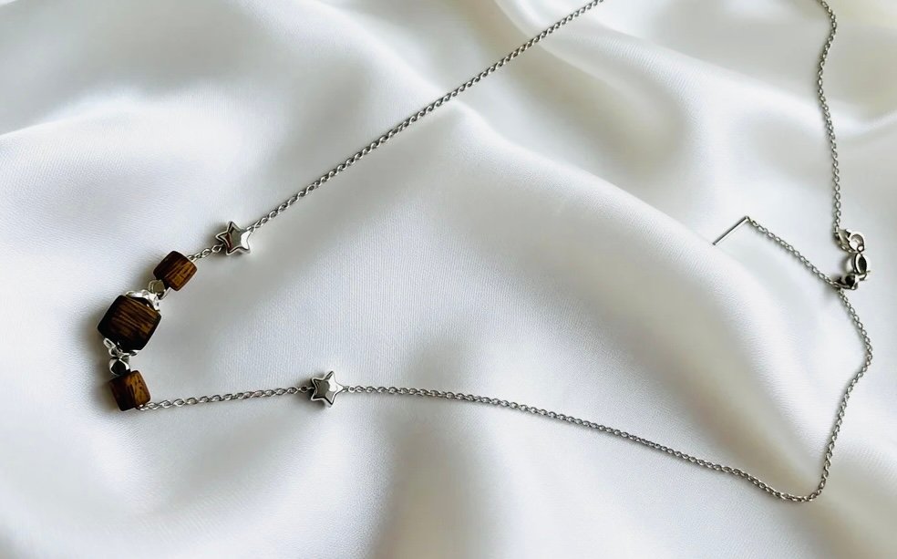 A delicate steel chain resembles a star trail in the night sky, adorned with two tiny star charms that add a playful touch. Three cube-shaped Kynam Agarwood beads release a gentle, lingering natural aroma, balancing the cool sleekness of silver with the warm serenity of wood. This necklace blends the calm of the forest with the romance of the stars, making it an understated yet textured accent for everyday looks.