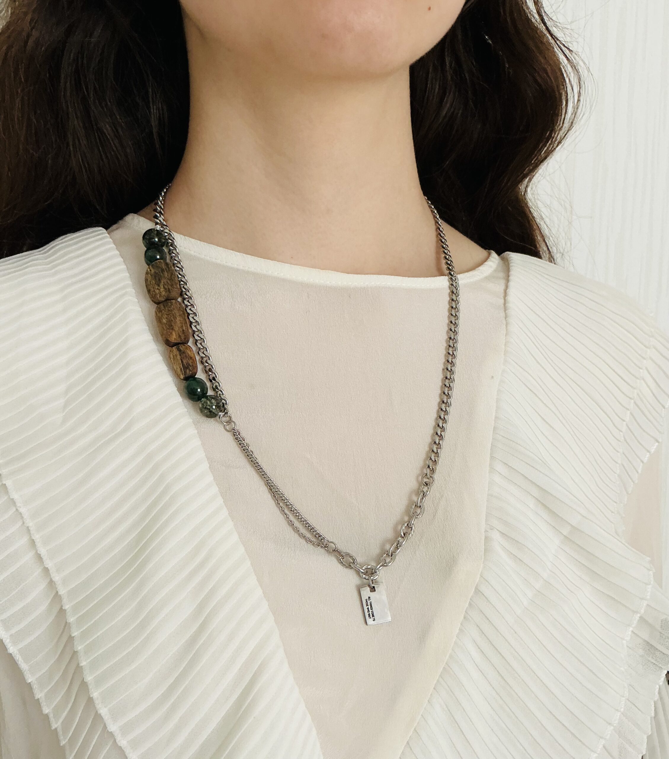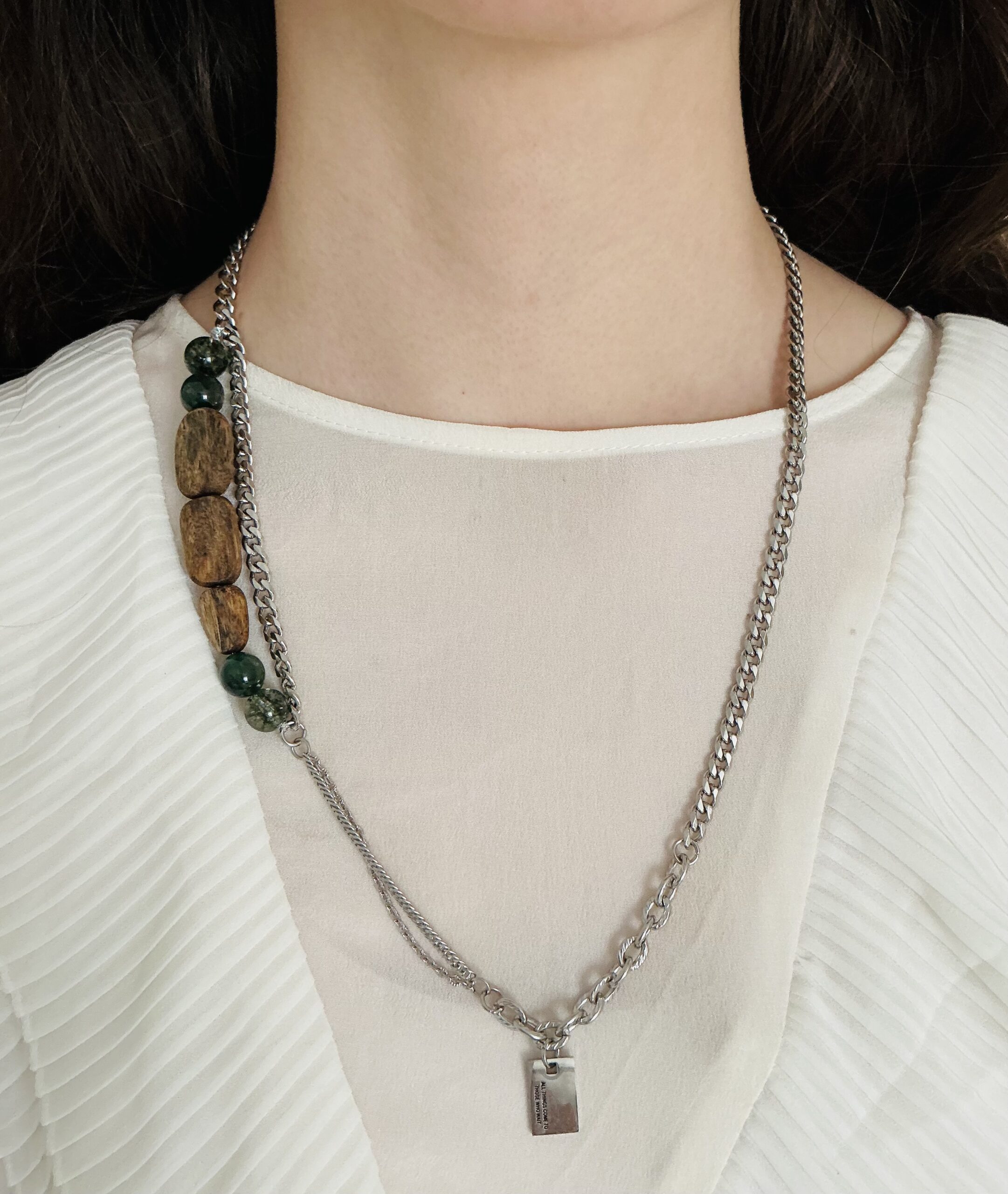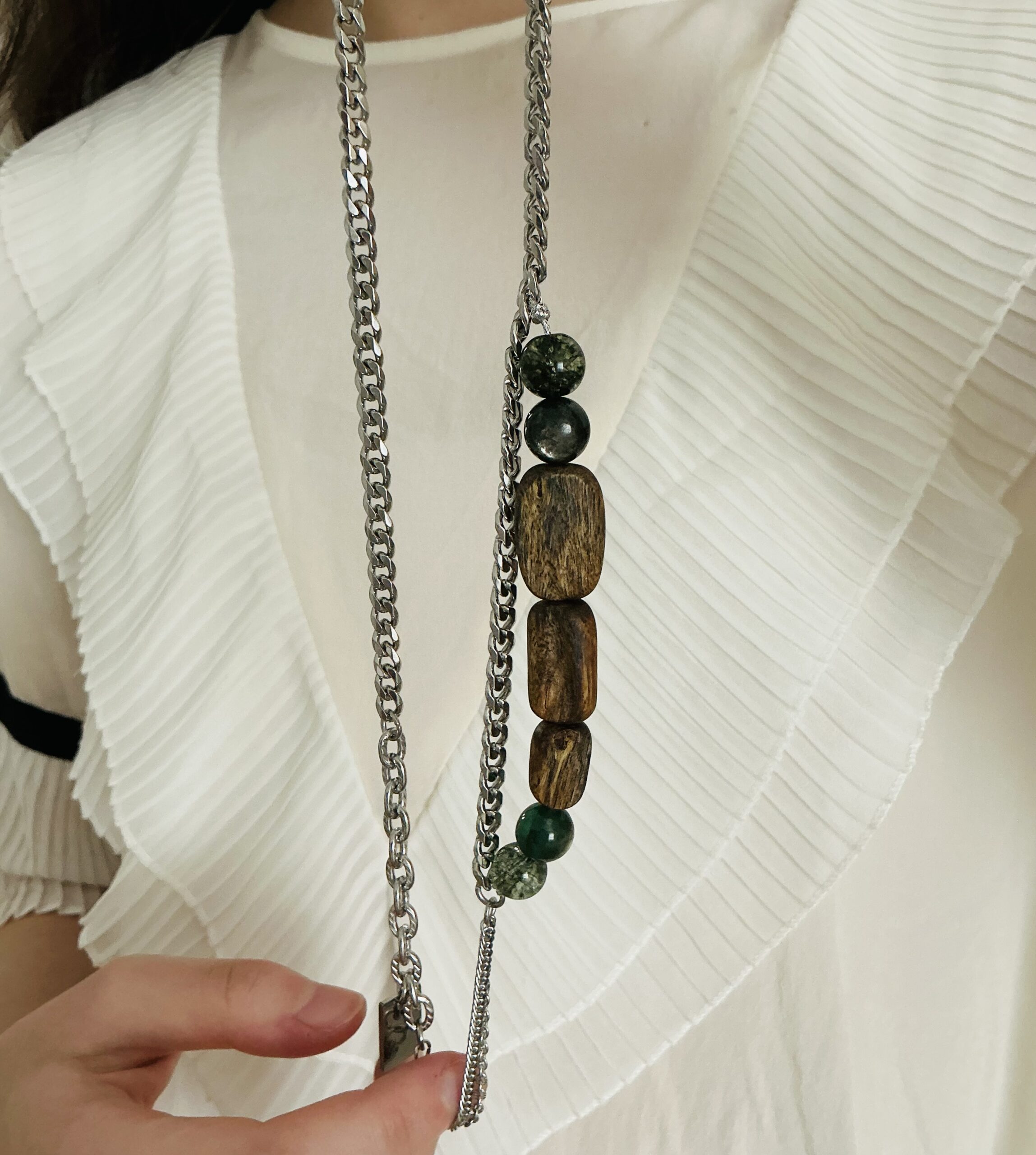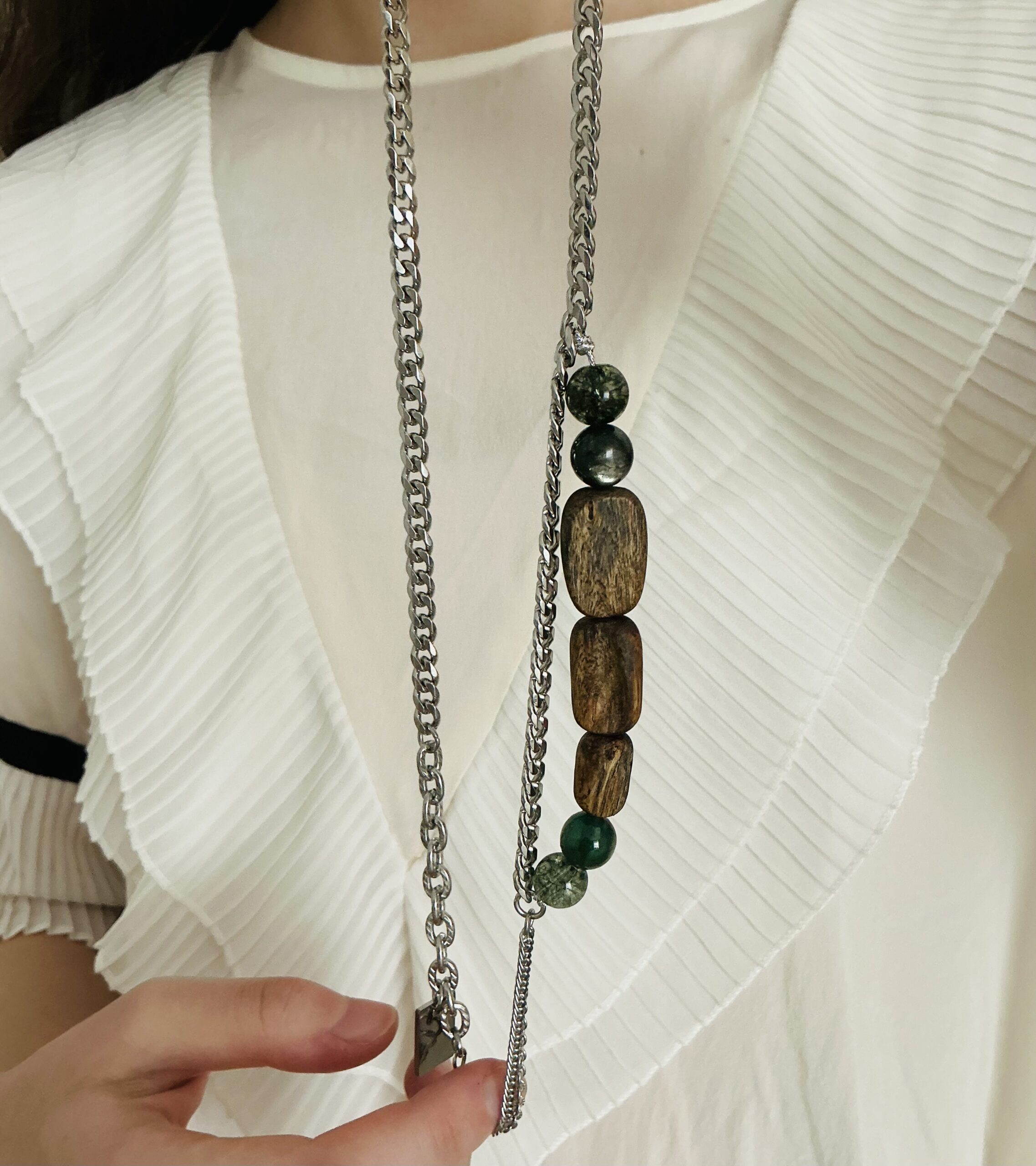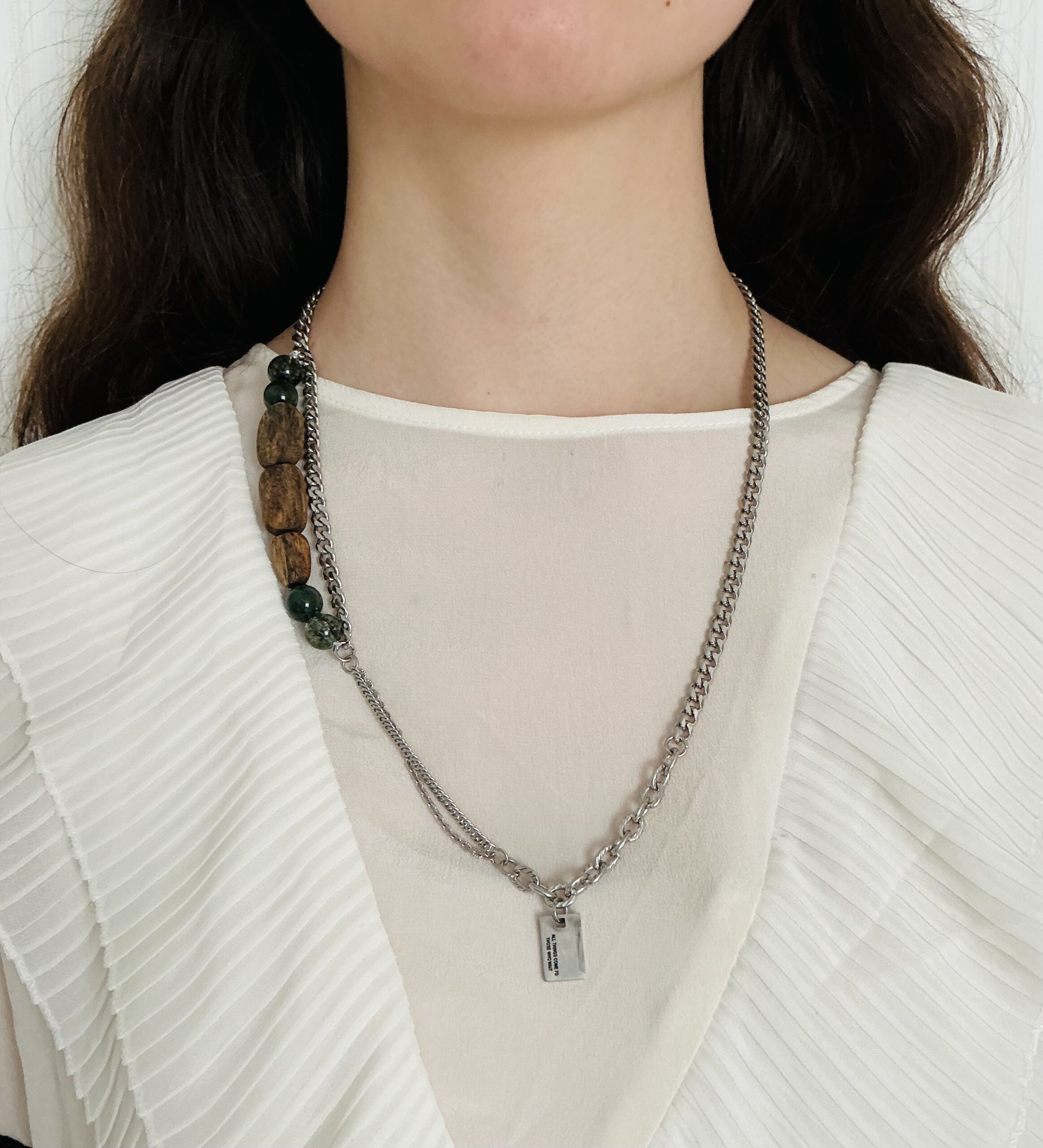 A string of aloes square beads is attached to the side of the trendy steel necklace, and clear green crystals are added as decorations. The collision of the two materials and colors instantly vitalizes the neck line, bringing a vivid vibe. This design combines personality and delicacy. Whether worn by young men who pursue trends or girls who prefer niche accessories, it can easily enhance the unique charm of the overall look.