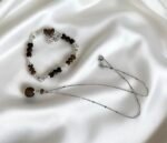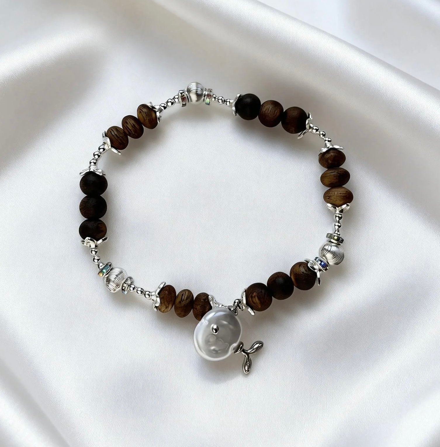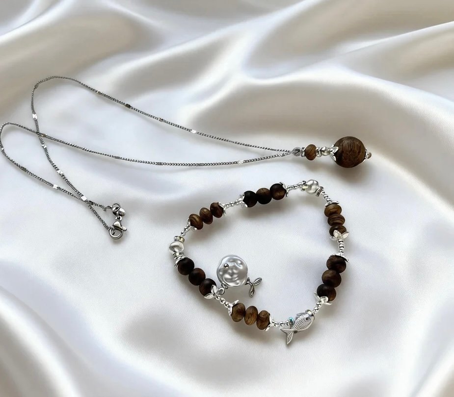 The cool, sleek sheen of Starlight Silver pairs harmoniously with the warm, woody texture of agarwood beads. The delicate silver necklace is anchored by a single, round agarwood bead, like a star nestled in the embrace of aged wood. The bracelet features alternating agarwood drum beads, accented with a playful pearl fish charm that adds a touch of whimsy. This set seamlessly blends Eastern elegance with minimalist modern style, making it a subtle yet sophisticated addition to both everyday and special-occasion looks.