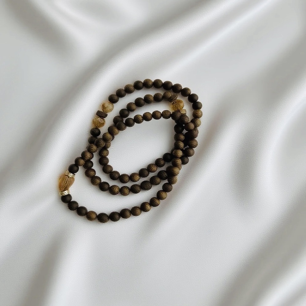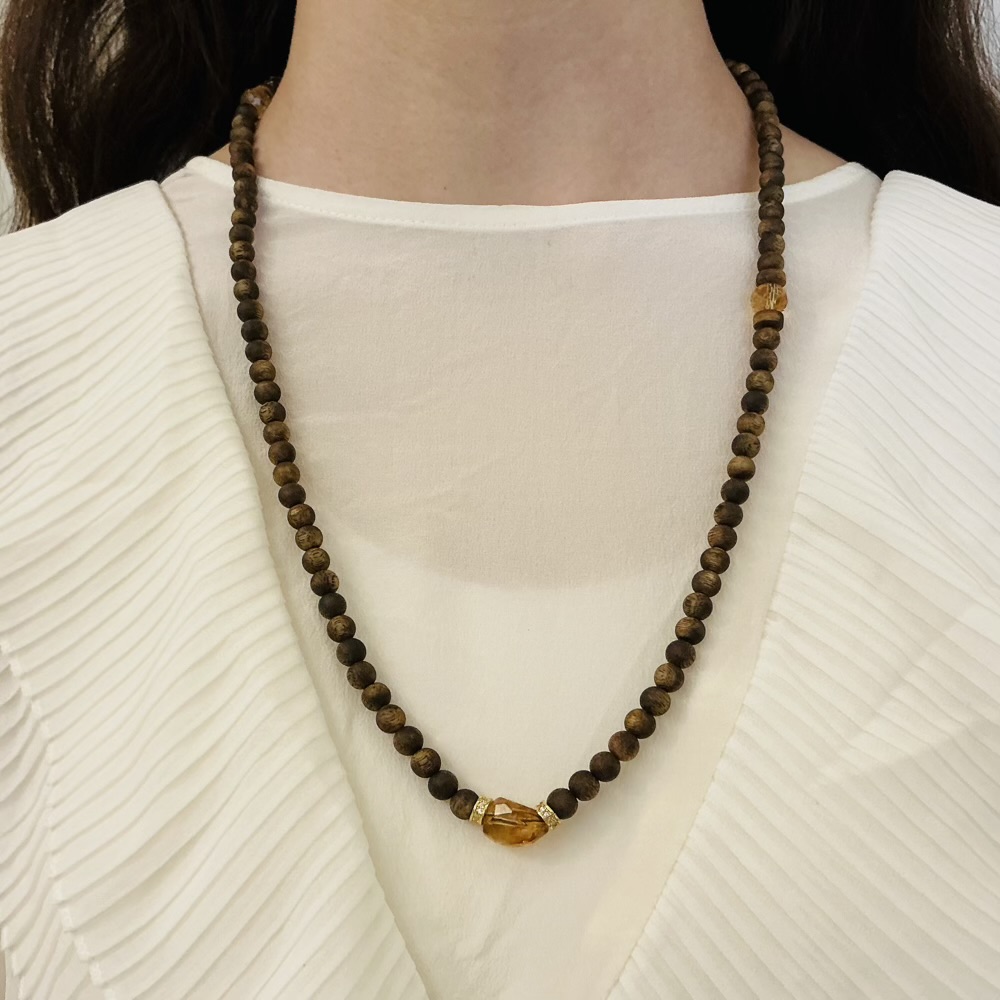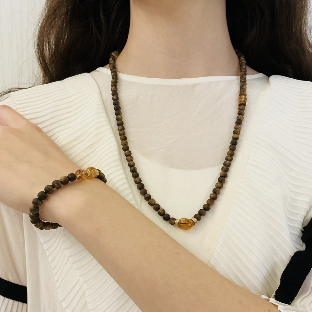 The necklace features agarwood beads as the main strand, with an amber diamond-shaped crystal placed every few beads. The sharp edges of the crystals contrast beautifully with the smooth roundness of the beads, creating a flowing, layered look. When worn, the necklace falls just at the collarbone, elongating the neckline while forming a visual focal point on the chest where the warmth of the agarwood meets the brightness of the crystals. Paired with a knit sweater or a cotton-linen shirt, it exudes a relaxed, gentle vibe.