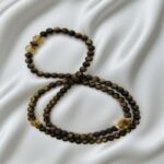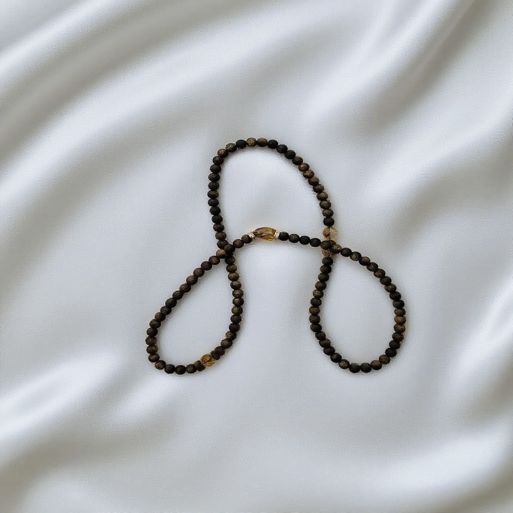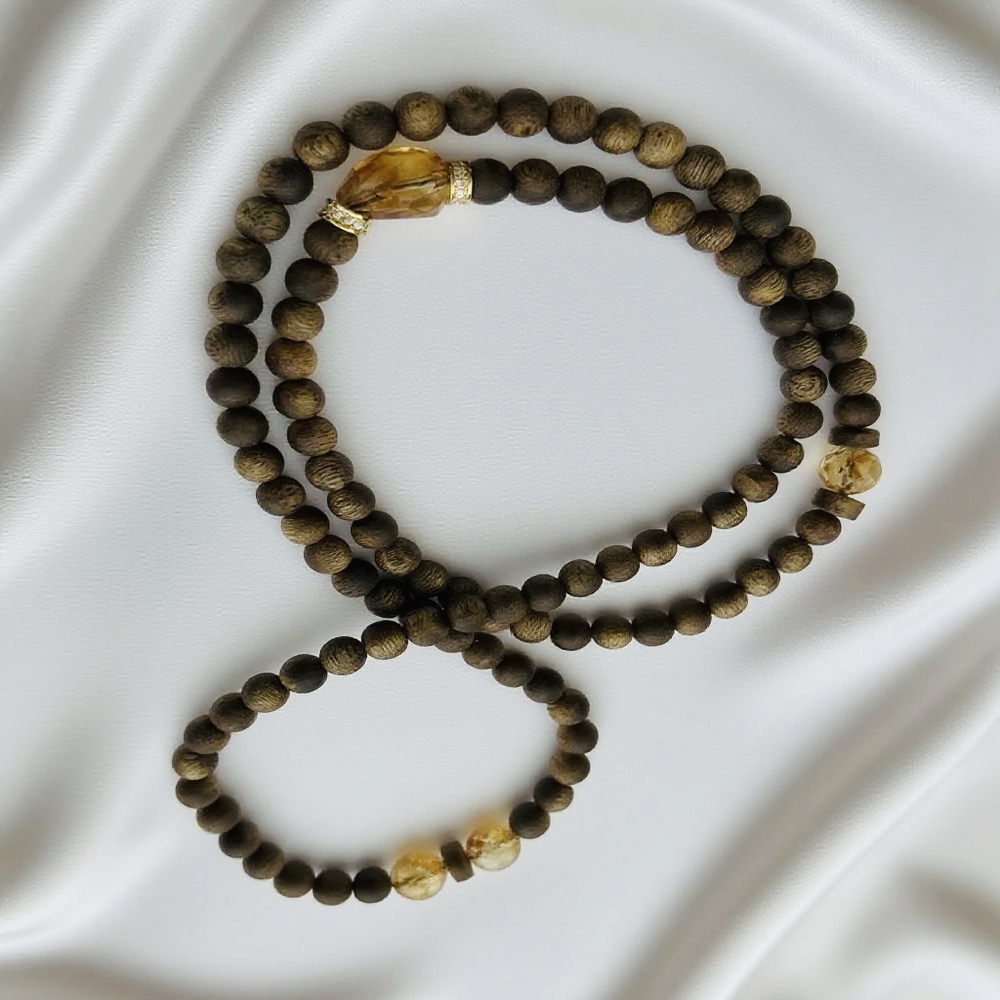 This necklace and bracelet set is crafted with 0.6 cm agarwood round beads as the base, accented with amber-colored diamond-shaped crystals. At first glance, it instantly evokes the leisurely comfort of a forest afternoon—sunlight filtering through the leaves, gently casting warmth onto the lush grass. Every detail radiates a soothing warmth and cozy comfort.