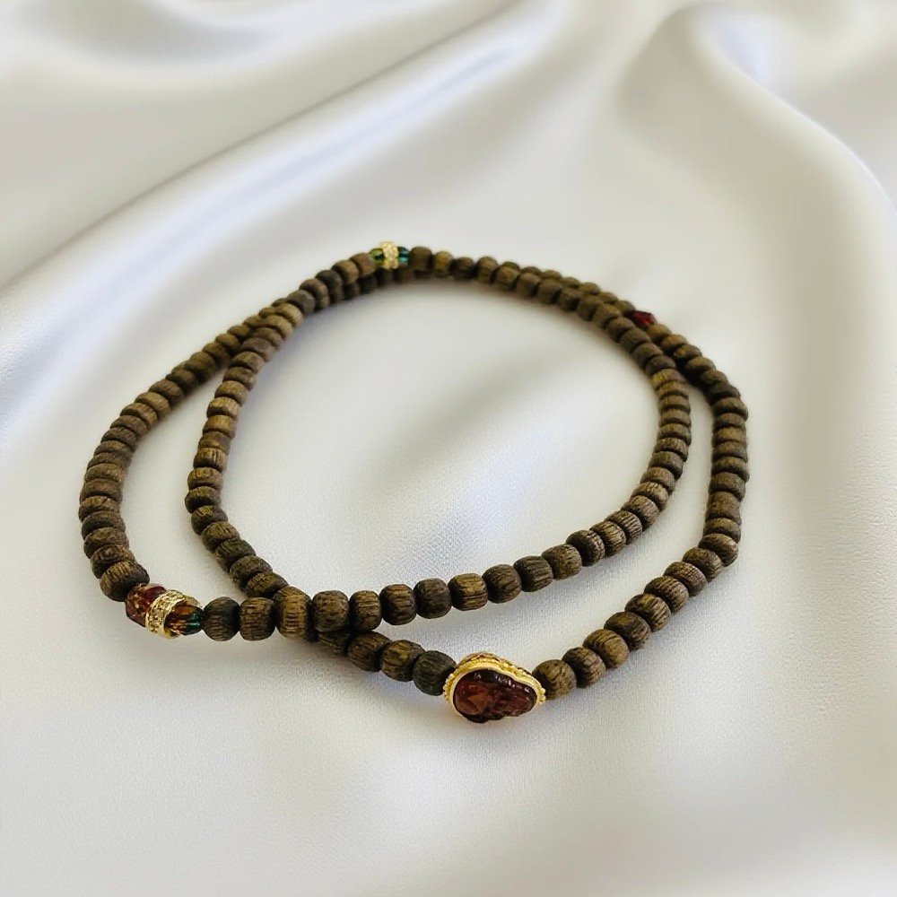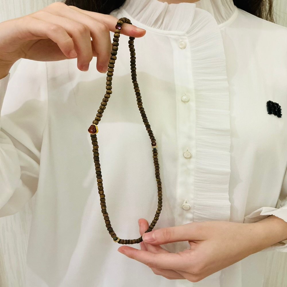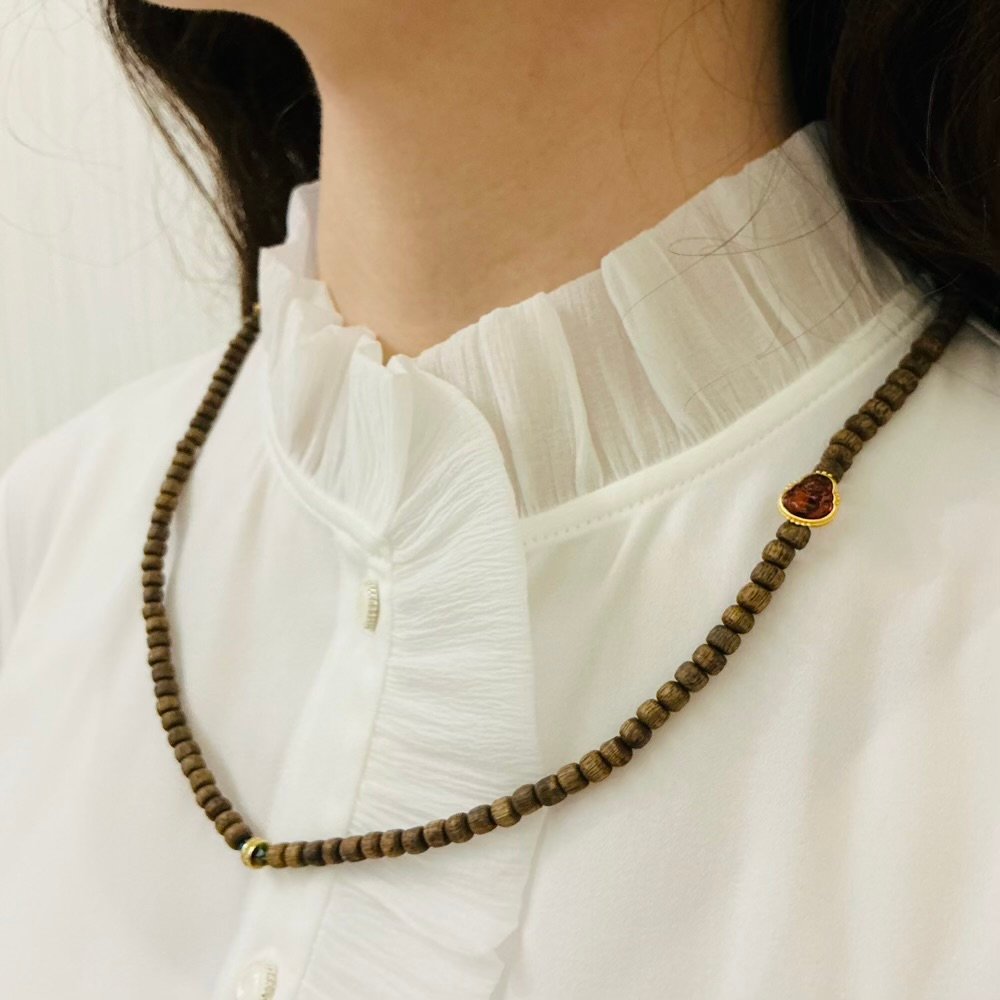 The pendant hangs at the center of the bead strand, balancing the overall visual while intensifying the atmosphere of “auspicious joy.” — When worn, the agarwood beads caress the skin with their warm touch, while the red crystal gently refracts crimson light with every movement. The Maitreya Buddha pendant rests gracefully upon the chest, like an amulet of auspiciousness. At a glance, one feels its unadorned joy and warmth. Whether worn daily or for special occasions, it infuses any ensemble with a vibrant spirit of celebration, conveying a heartfelt wish for life’s beauty.