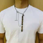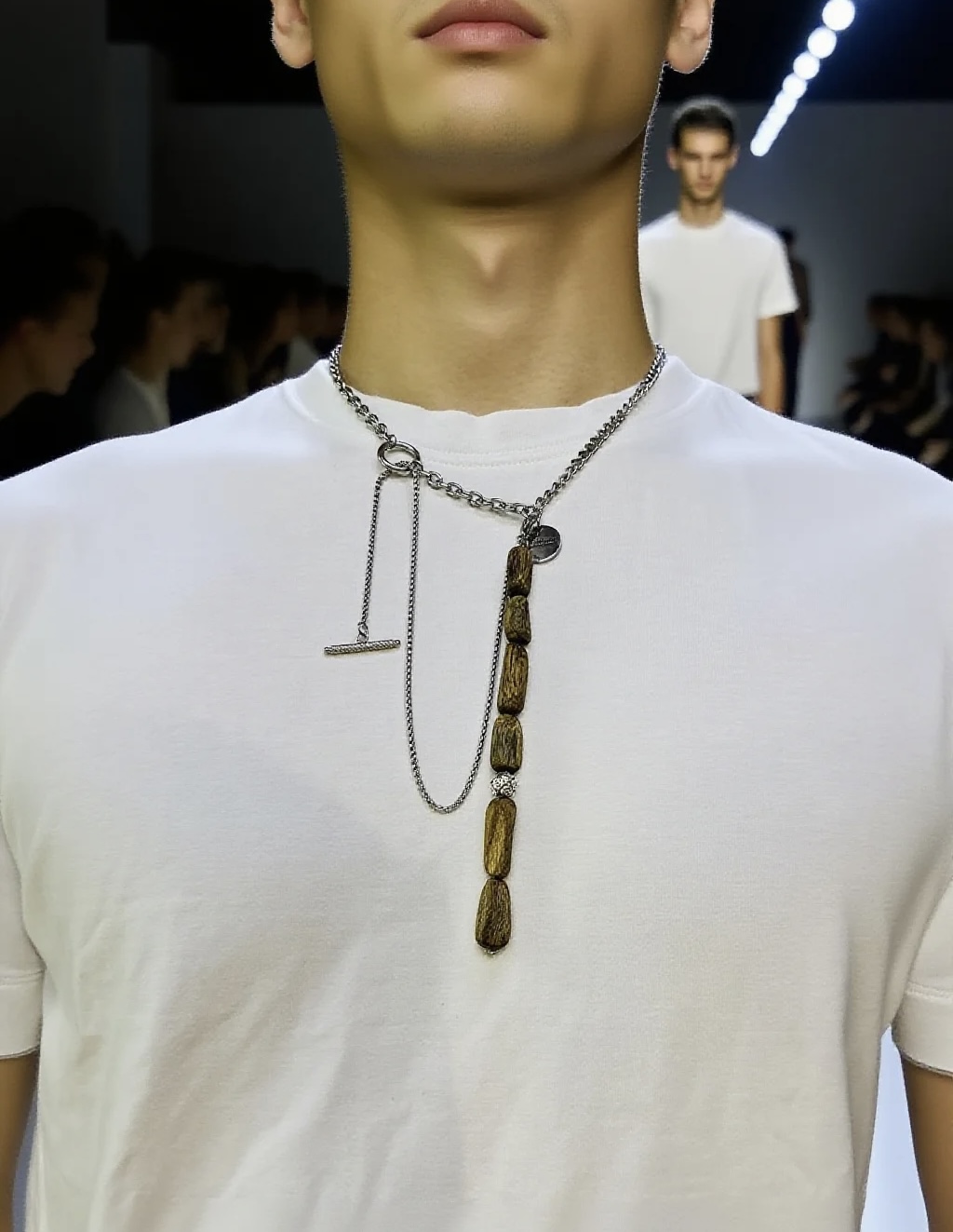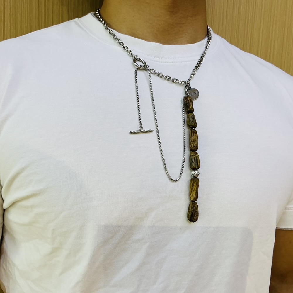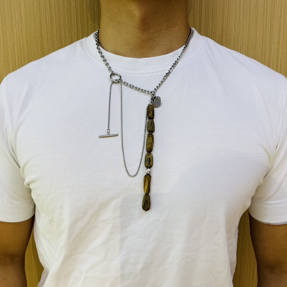 This designer steel chain features elongated agarwood beads, giving it a highly personalized touch. The cool, sturdy texture of the steel chain contrasts sharply with the smooth, warm agarwood beads. The agarwood beads have a deep, rich color with natural grain patterns and a subtle, elegant fragrance, hanging gracefully between the links of the chain to add a rustic and refined charm. When worn with a simple white top, the steel chain’s sleek, modern vibe stands out, while the presence of the agarwood beads brings a unique Eastern flair, skillfully blending industrial style with natural, timeless beauty—perfectly showcasing the wearer’s individuality and taste.