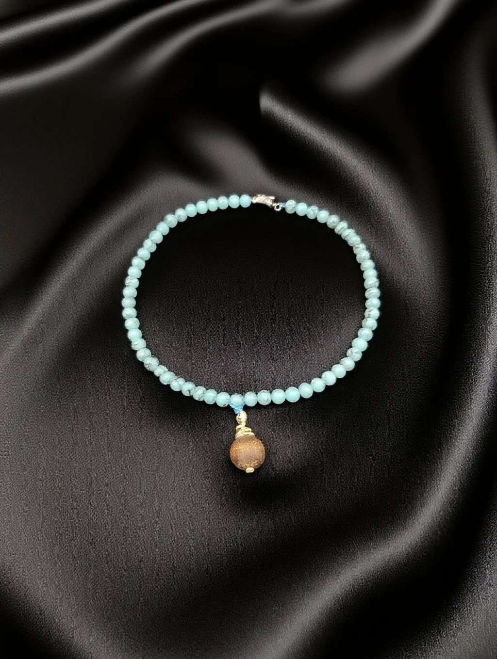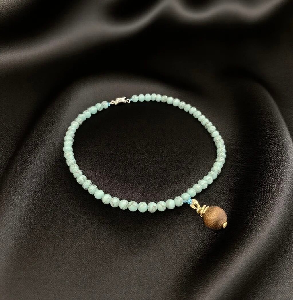 This turquoise necklace, with each turquoise bead in a clear blue-green hue like frozen fragments of a sunny sky’s waves, is so clean that it doesn’t have a trace of impurity; the single agarwood pendant hanging alone, with its warm wood color, seems to be wrapped in the aged agarwood fragrance, exuding a low-key elegance in simplicity.