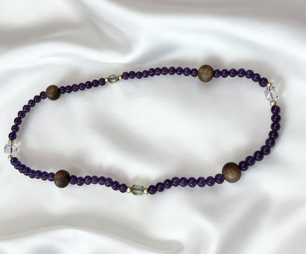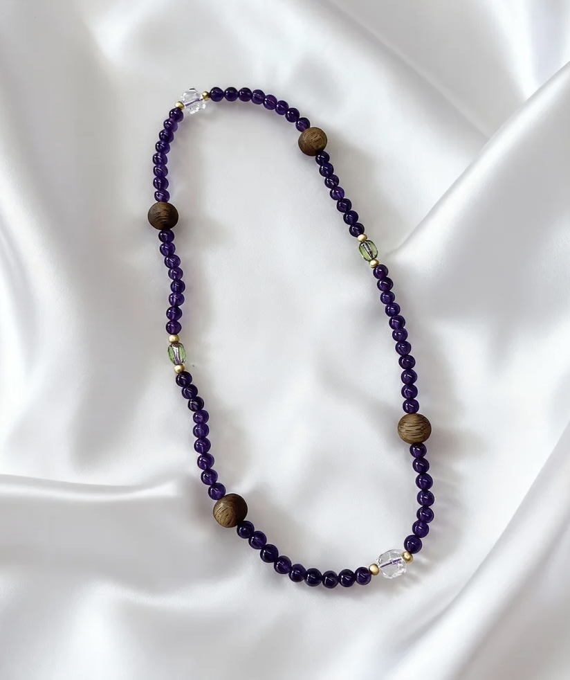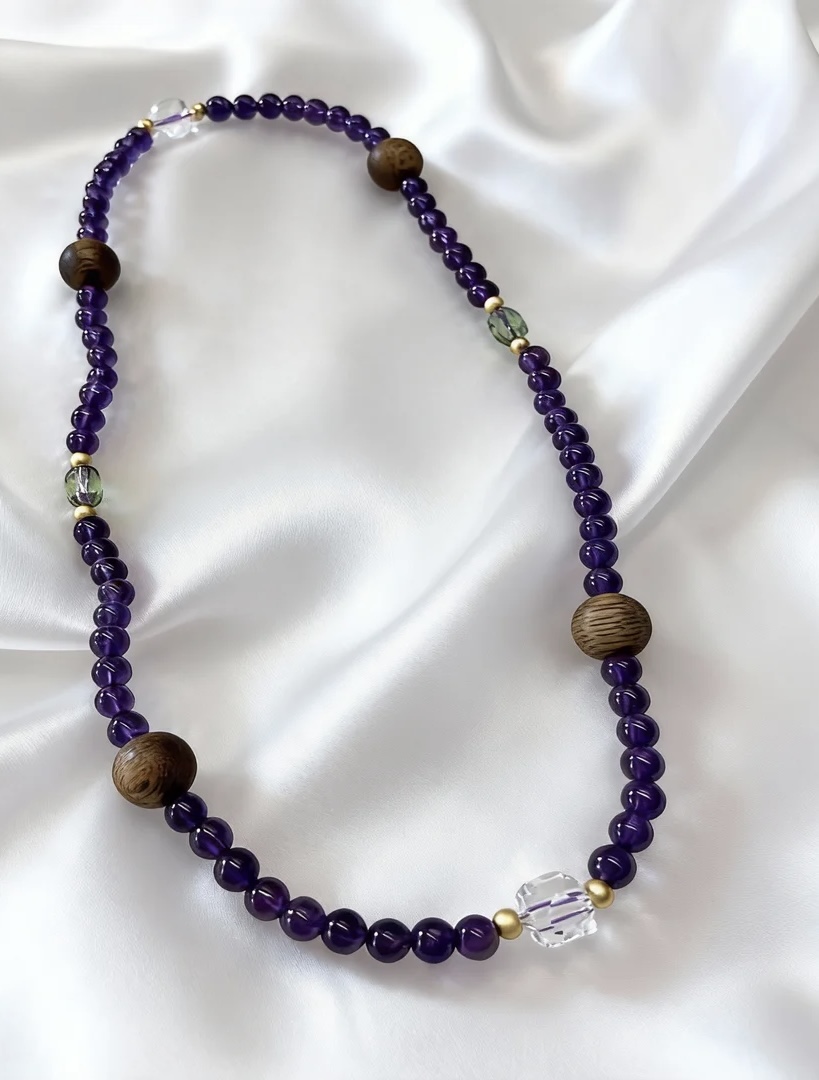 Uruguayan amethyst, known for its deep and saturated purple hue, brings a sense of calm and luxury. The agarwood bead adds a touch of natural warmth and unique aromatic charm, while the clear crystal enhances light transmission and brightness of the whole bracelet, and the Czech green crystal injects a fresh and vivid vibe. This piece perfectly blends the noble grace of amethyst, the tranquil aura of agarwood, the purity of clear crystal and the liveliness of green crystal, making it an ideal accessory for both daily wear and collection.