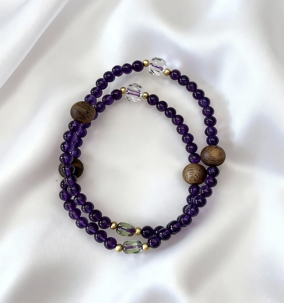 This double-loop bracelet is exquisitely crafted with 0.5cm Uruguayan amethyst beads as the main body, paired with a 1.0cm agarwood bead that emits a faint, elegant fragrance. It is also inlaid with square sugar-shaped clear crystal and vibrant Czech green crystal beads.