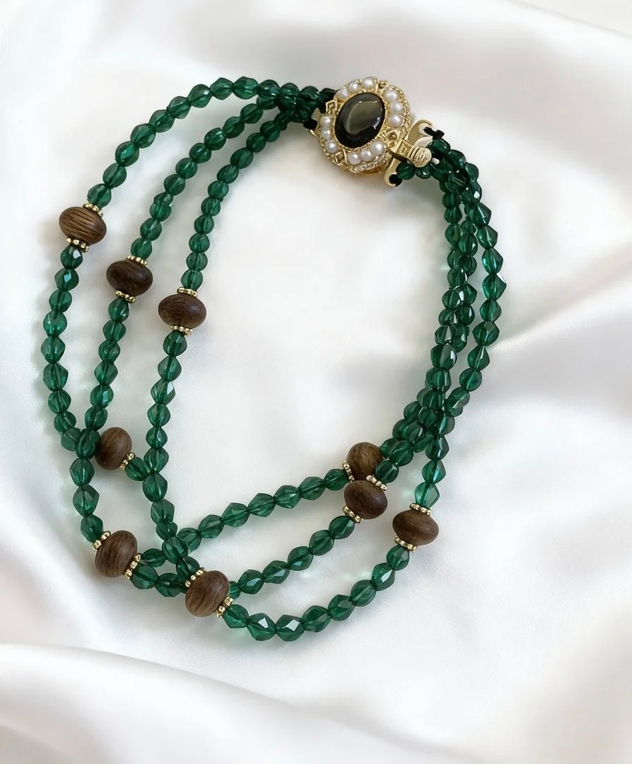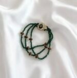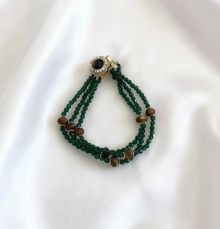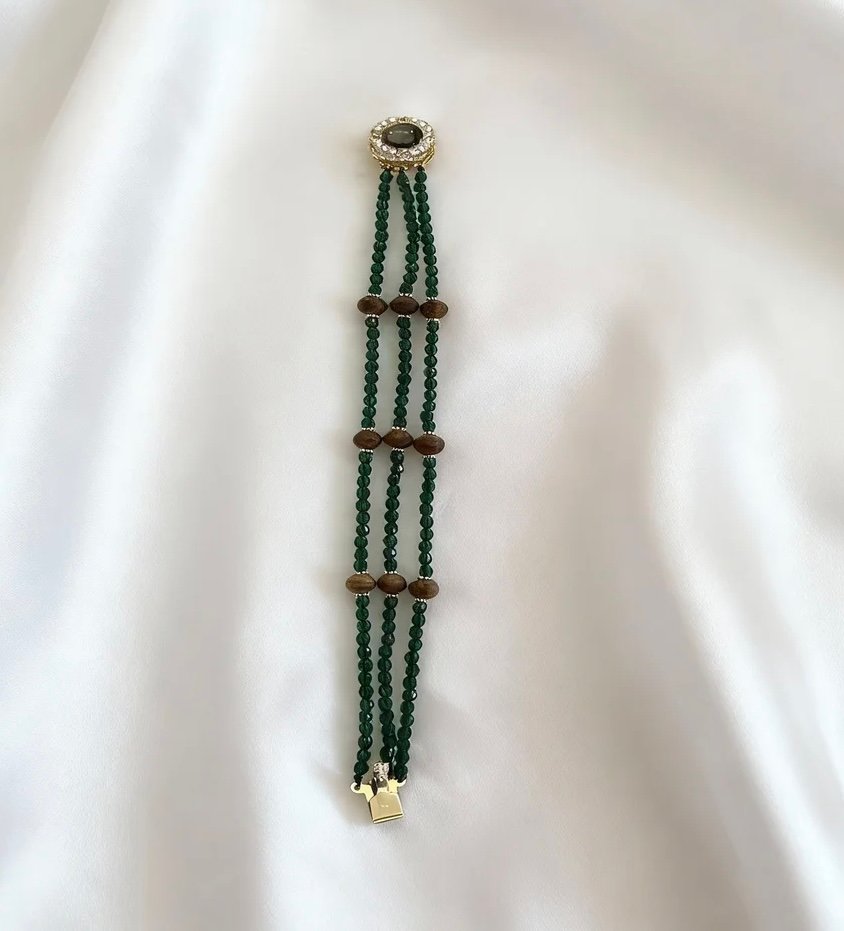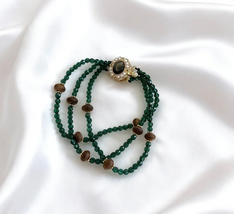 The “Verdant Agarwood Moon Clasp Bracelet” features three layers of royal green crystal beads, cascading like a clear emerald stream, accented with Kynam Agarwood beads whose rich, natural texture complements the luminous green hue. The top clasp, set with black mother-of-pearl and encrusted with zircon, resembles a moon holding a pearl, where the gentle luster of mother-of-pearl meets the sparkling brilliance of zircon. It weaves Eastern elegance with light luxury into a single piece, so every movement of your wrist carries the freshness of mountain forests and the glow of stars and moon.