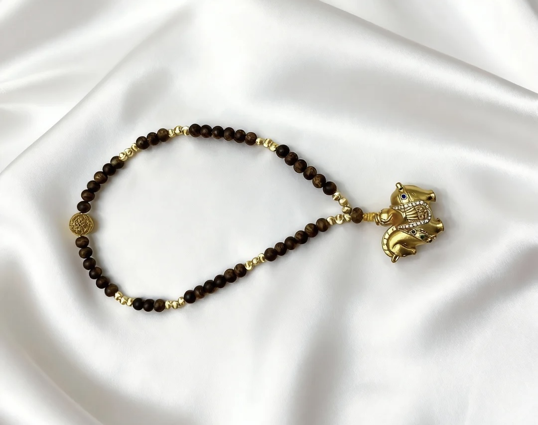 Crafted with a braided cord featuring carefully selected Kynam Agarwood beads and brushed gold beads, it is paired with a highly textured matte gold Tang-style horse pendant. The mellow woody warmth of Kynam Agarwood tempers the opulence of the gold accents; the retro and exquisitely designed Tang-style horse symbolizes career prosperity and abundant blessings flowing into the home.